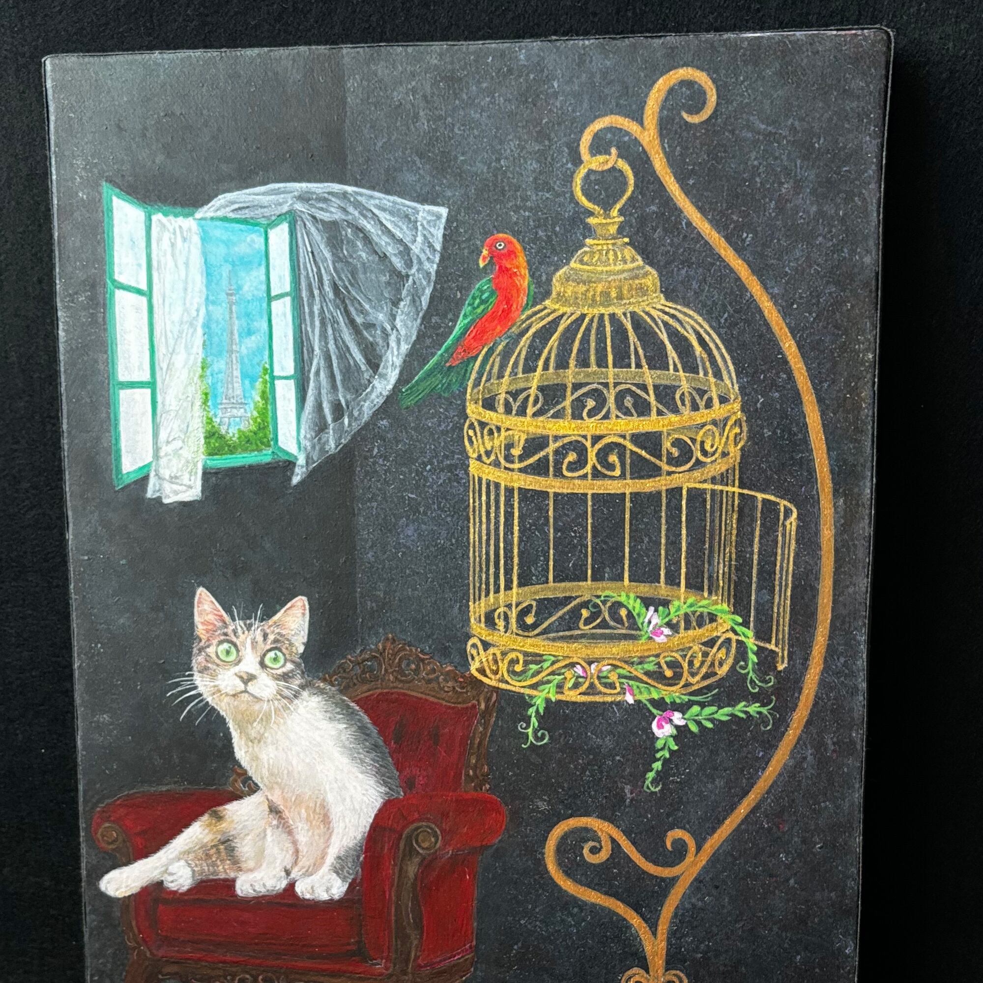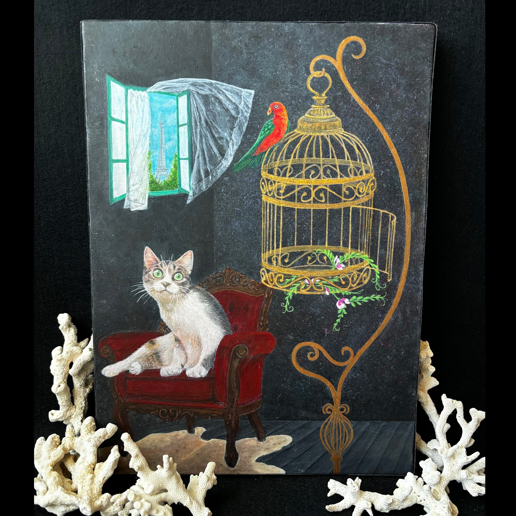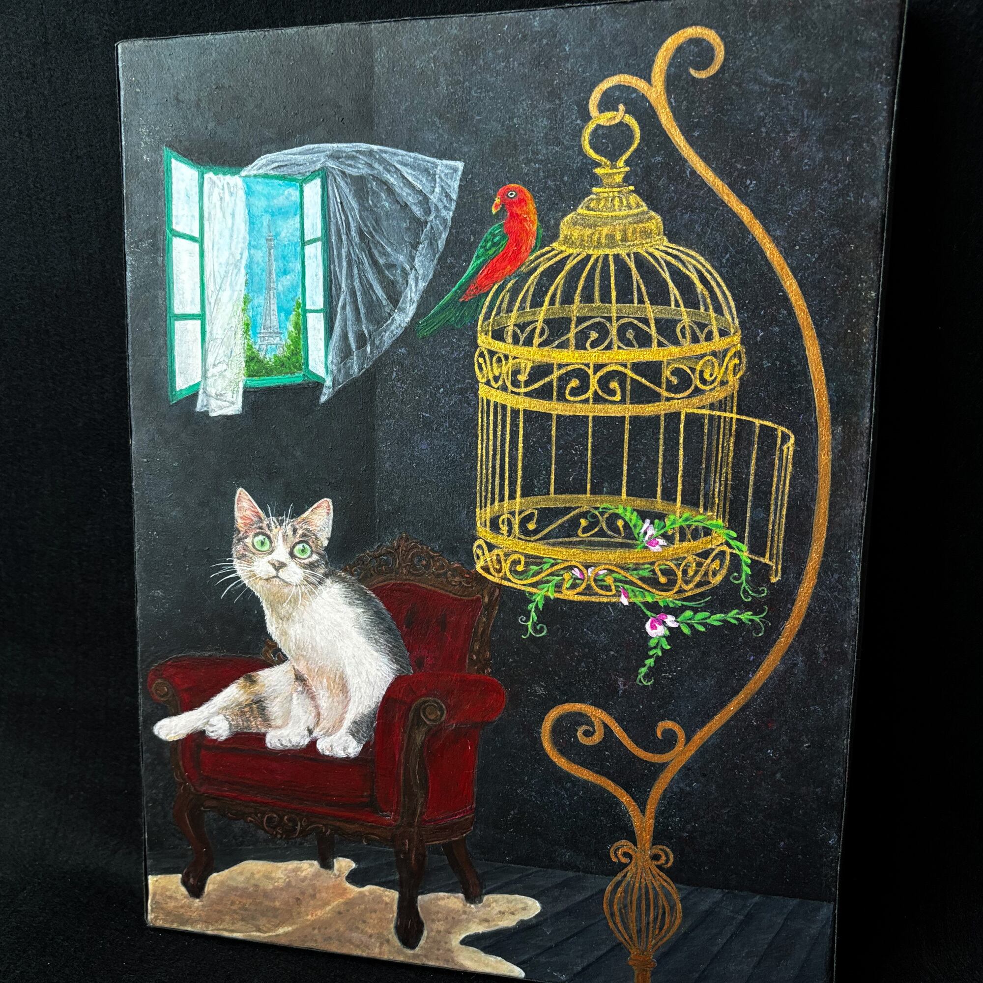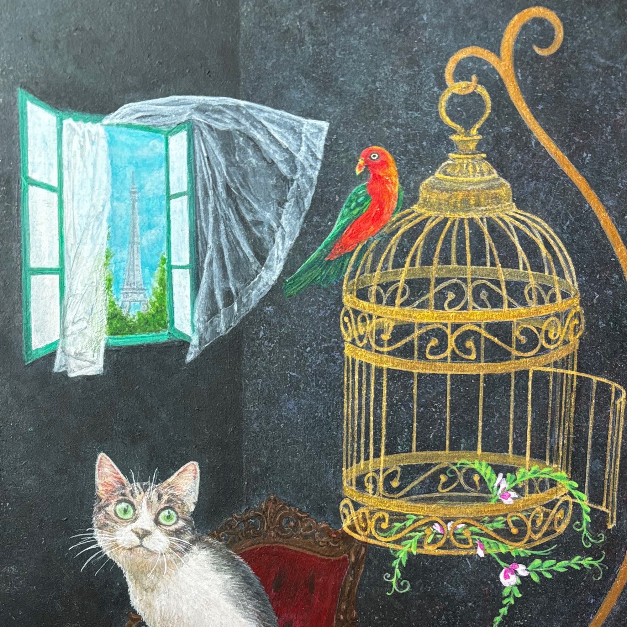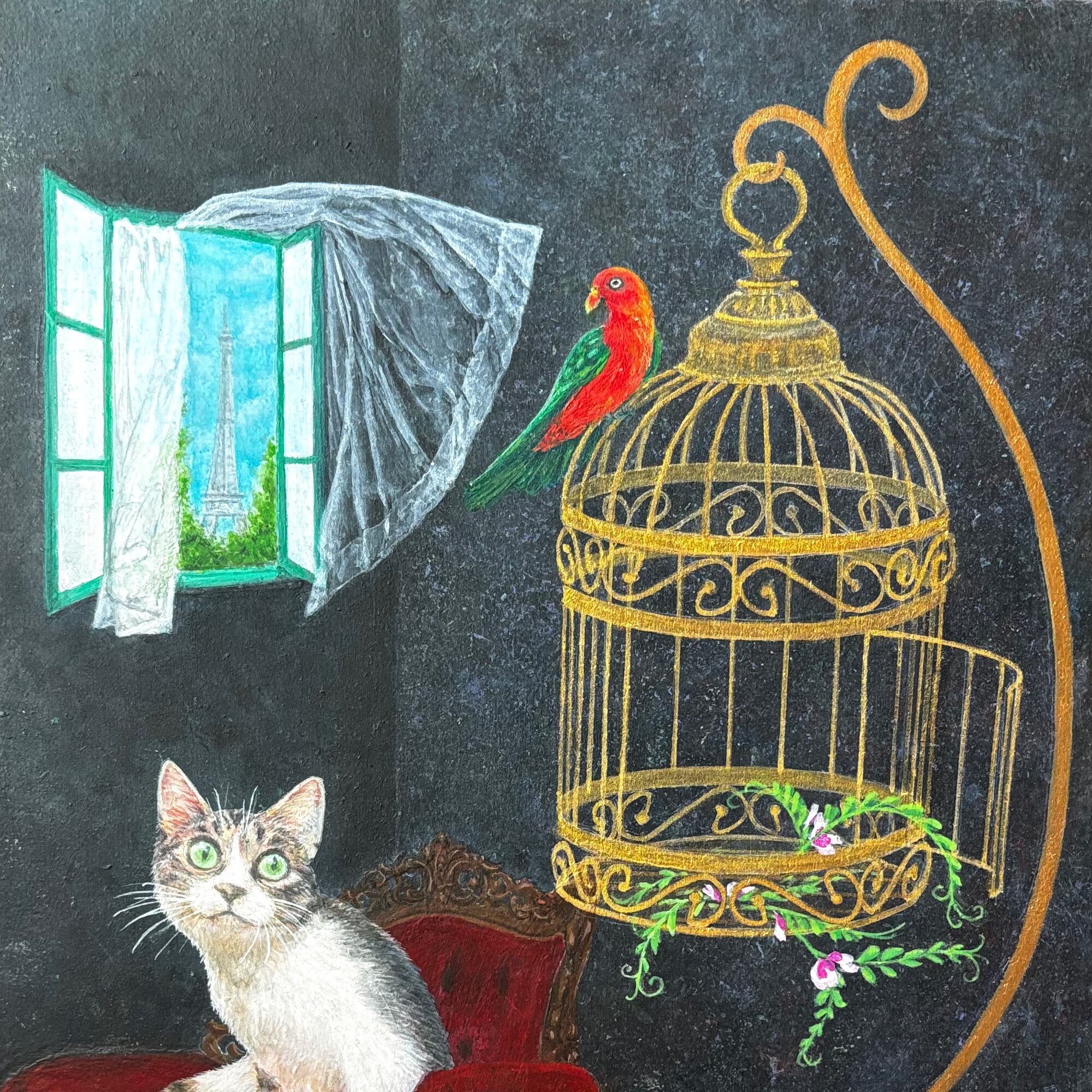 薄暗いアパートメントの屋根裏部屋で、鍵が開いた鳥かごの外側に色鮮やかな鳥がたたずみます。