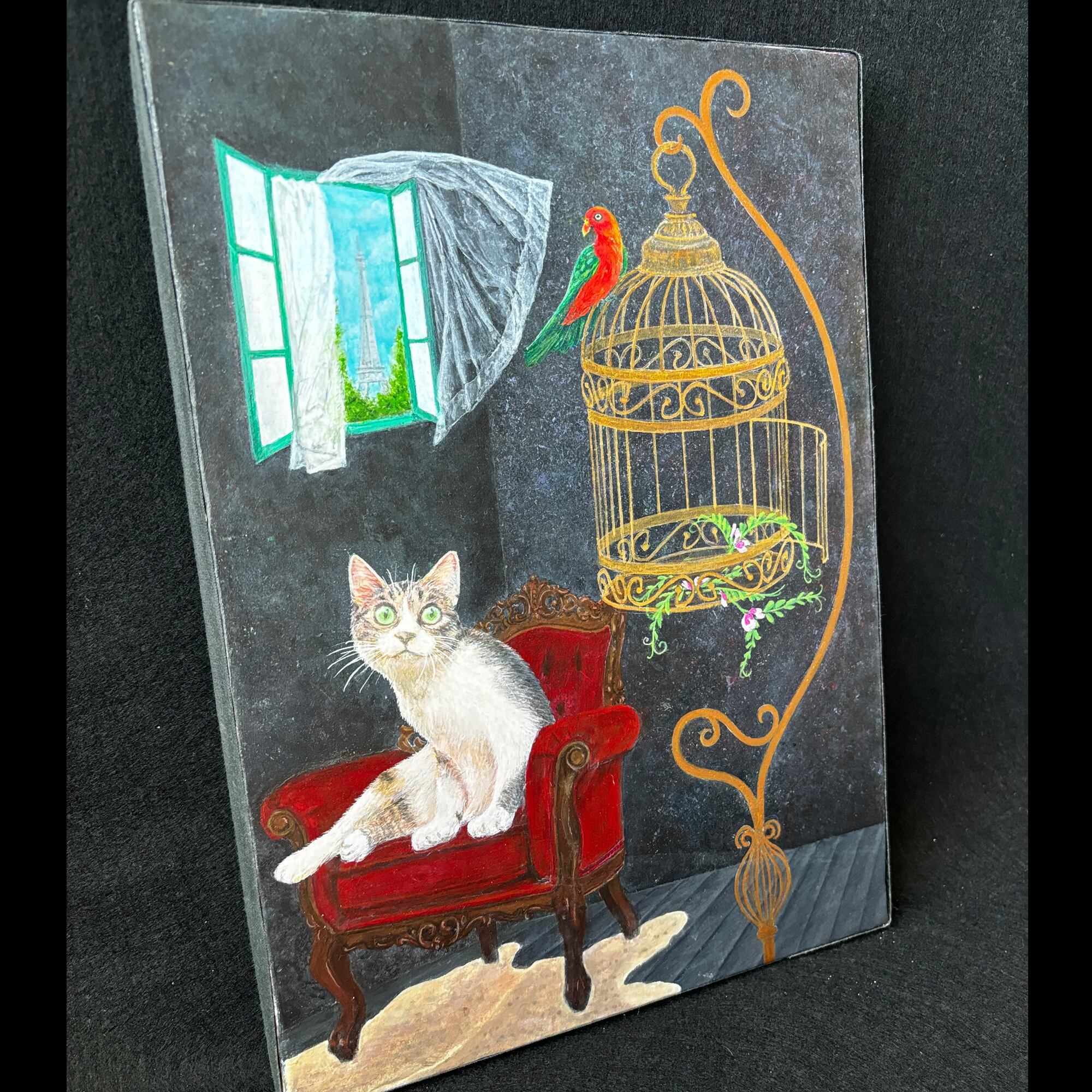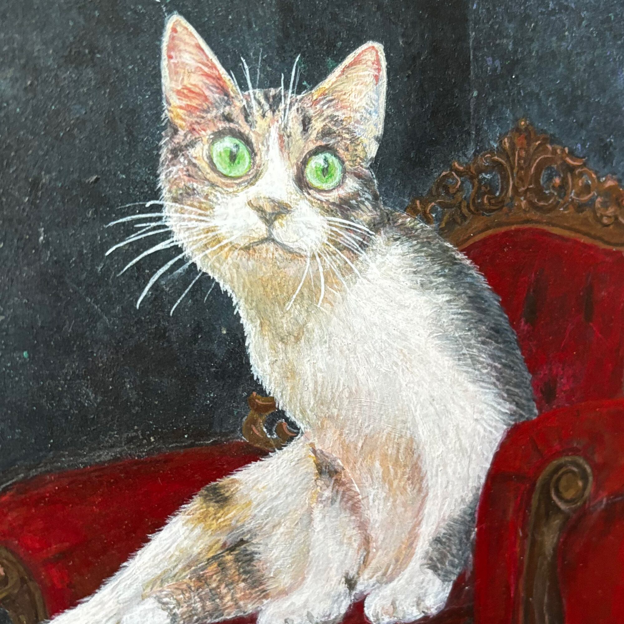 それをヴィンテージ風の椅子に座った猫が、大きく見開いた瞳で見つめます。