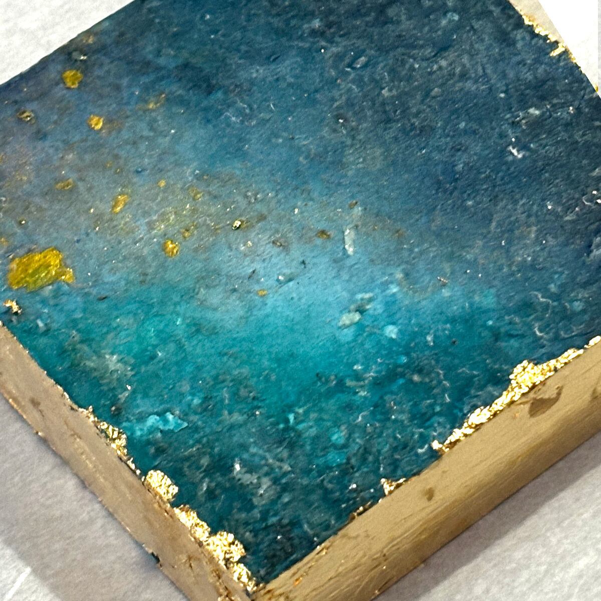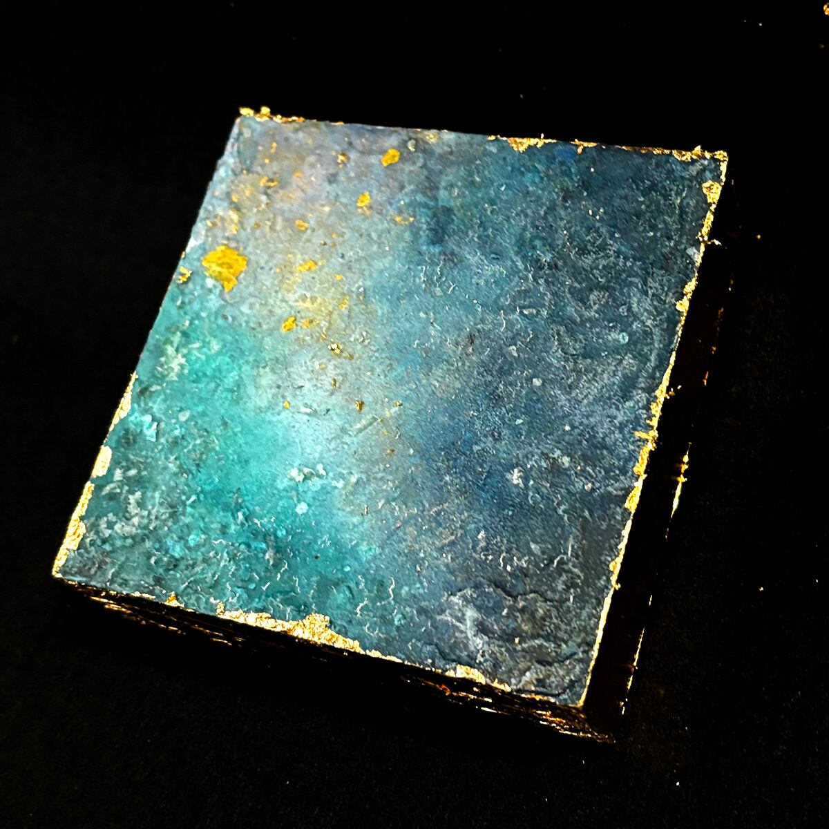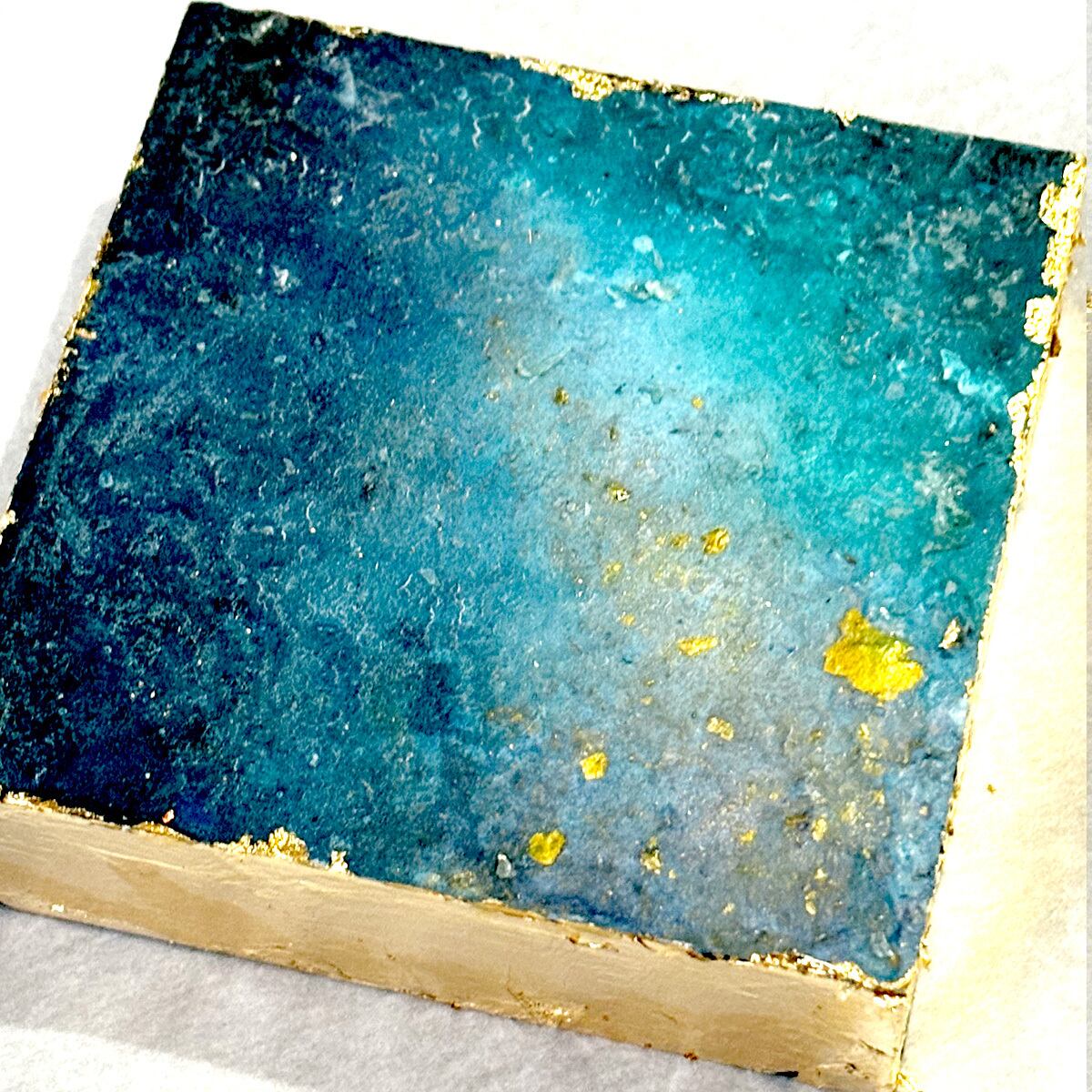10センチ角の木製ボックスに、それぞれジェッソや絵の具を流し込んで唯一無二の世界を創造!