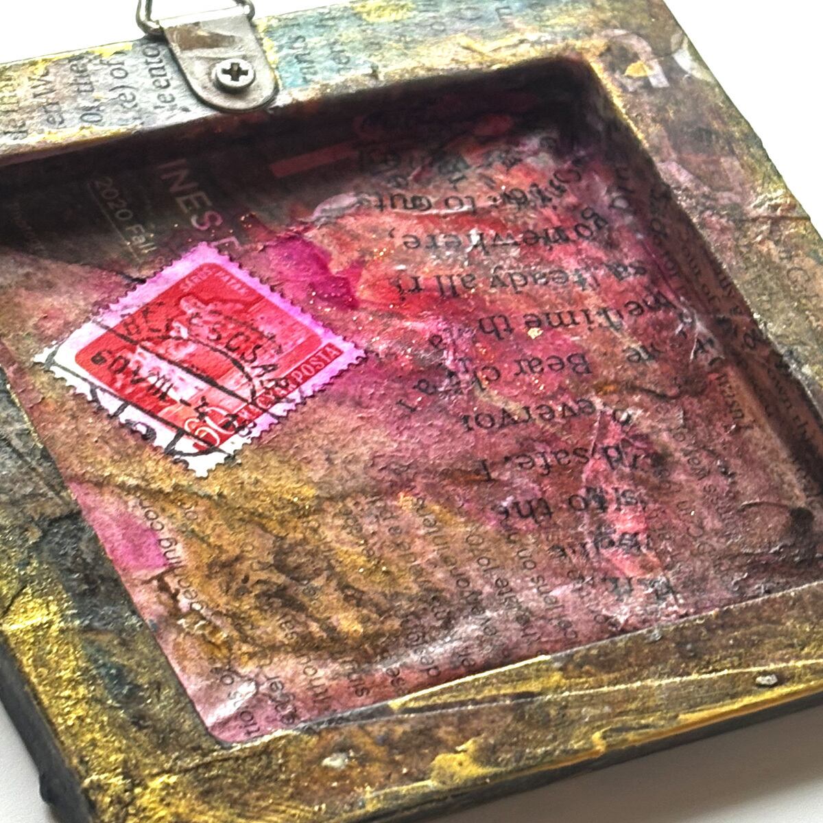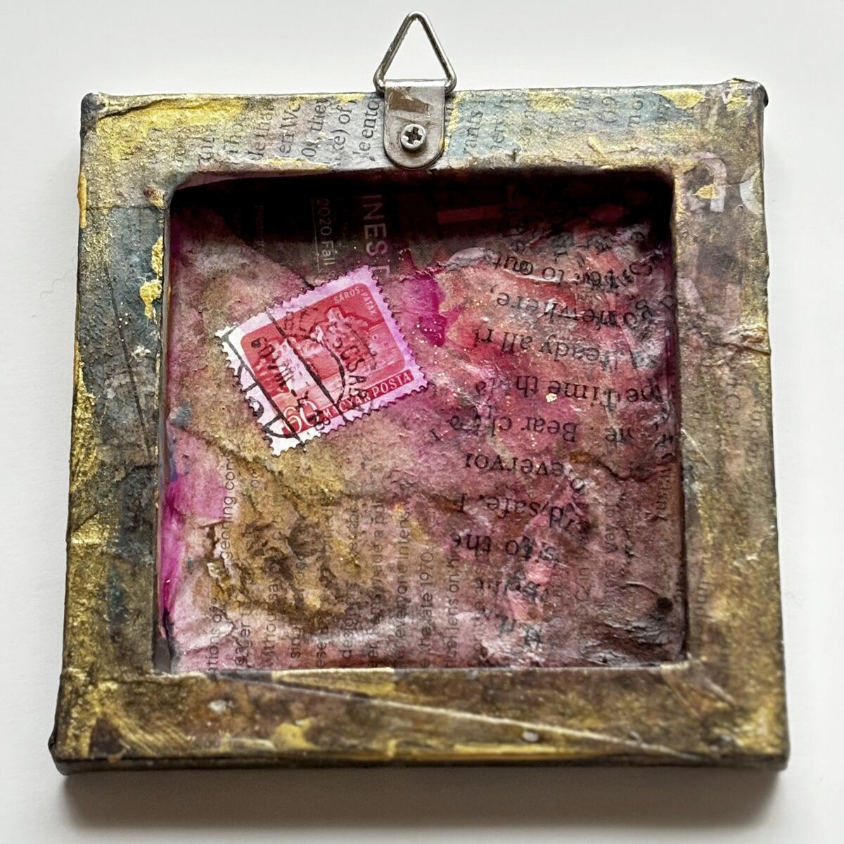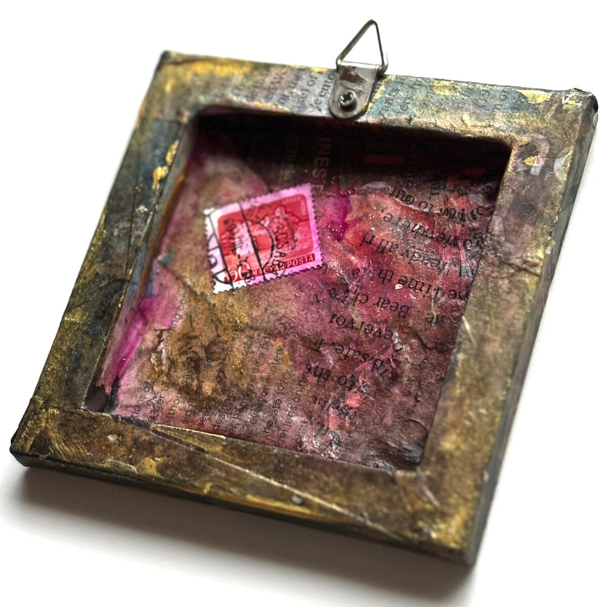 小さなキャンバスを、英字新聞や雑誌などでコラージュし、アンティーク風にしました。