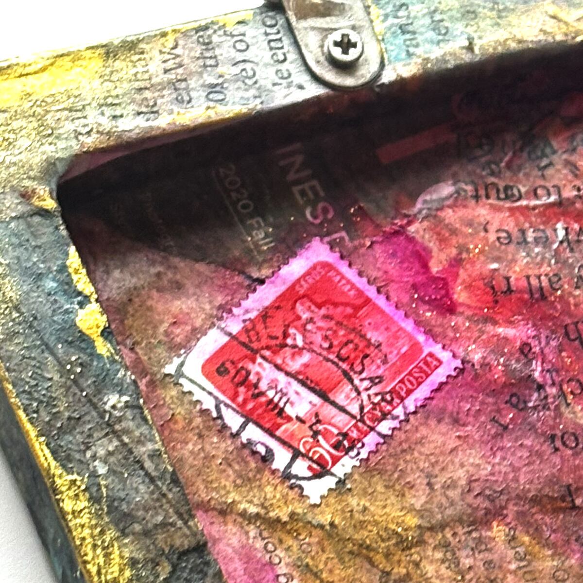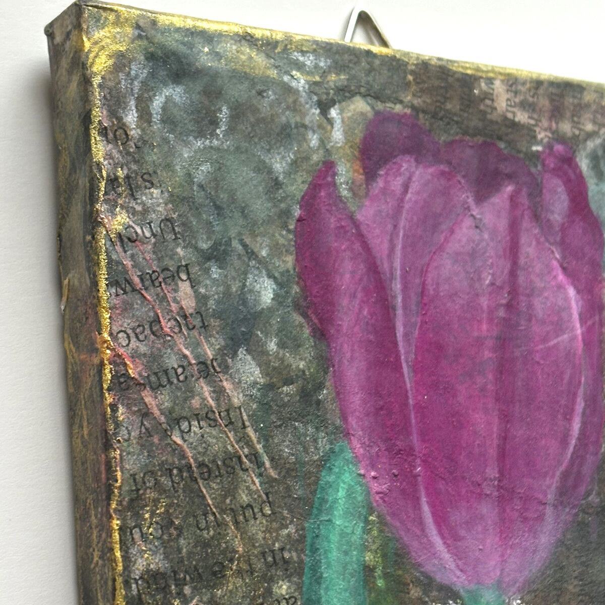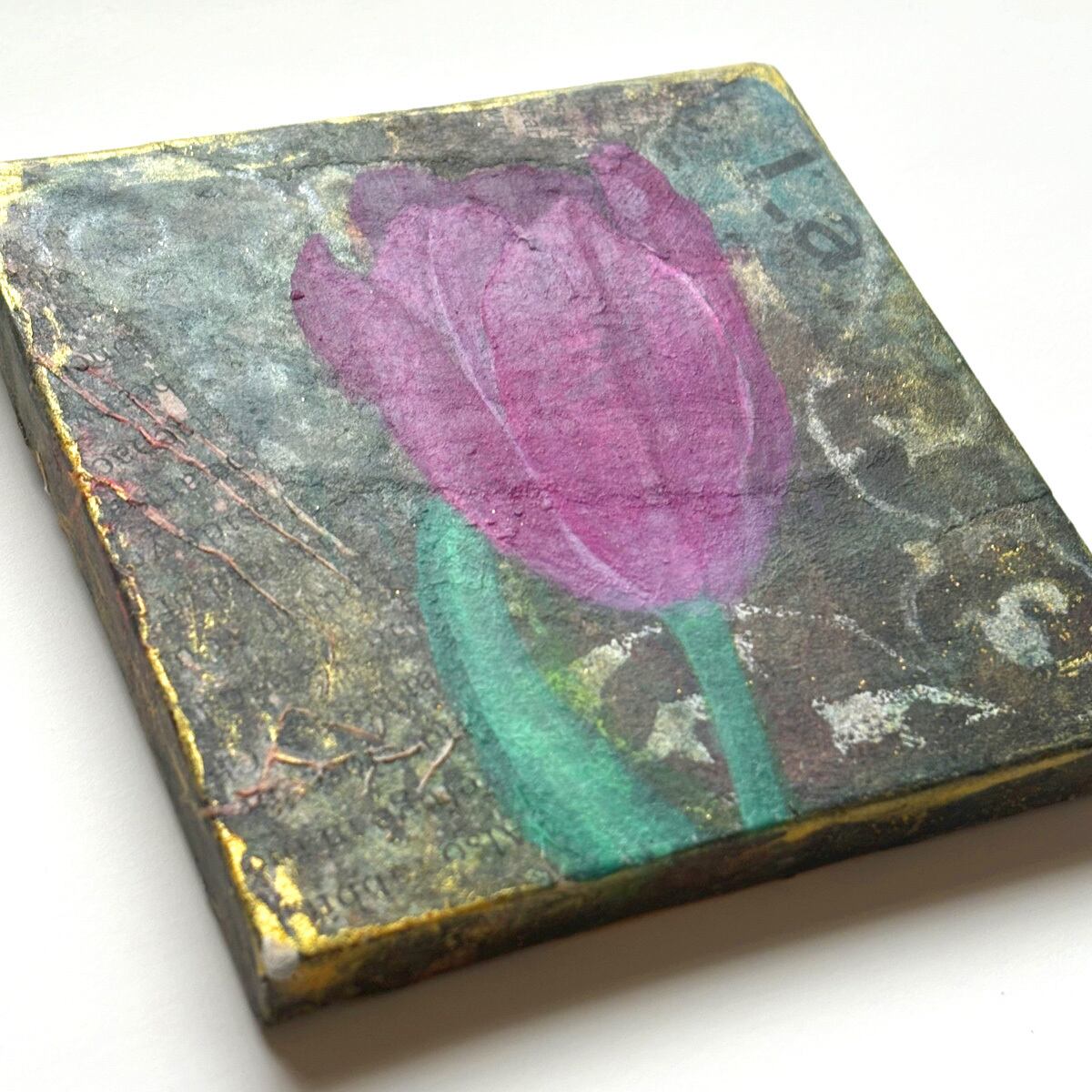 小さなキャンバスを、英字新聞や雑誌などでコラージュし、アンティーク風にしました。