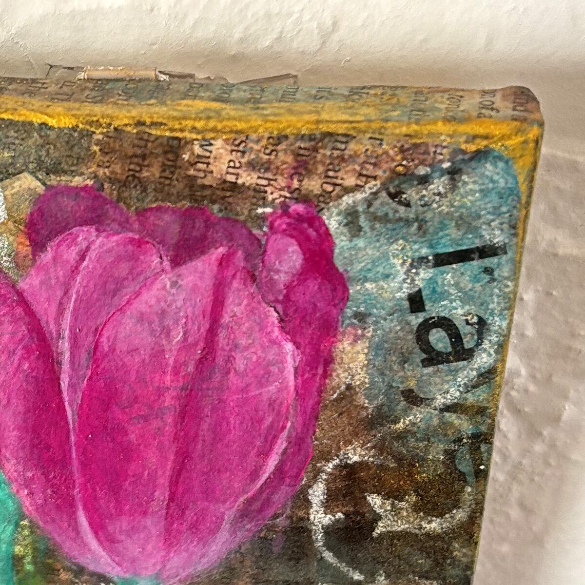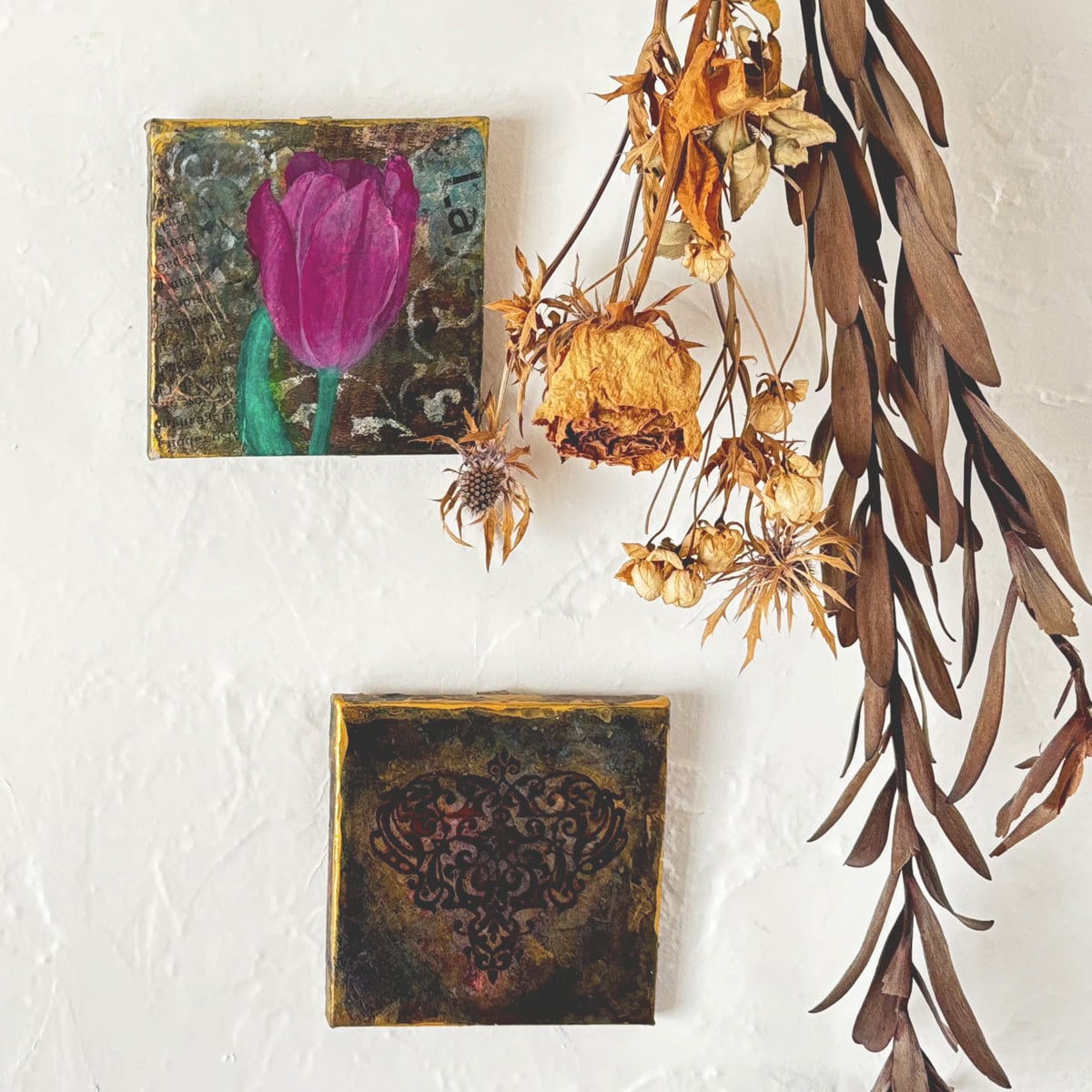 落ち着いたブラウン系の背景にはステンシルアートを施し、手描きでチューリップを描き添えました。