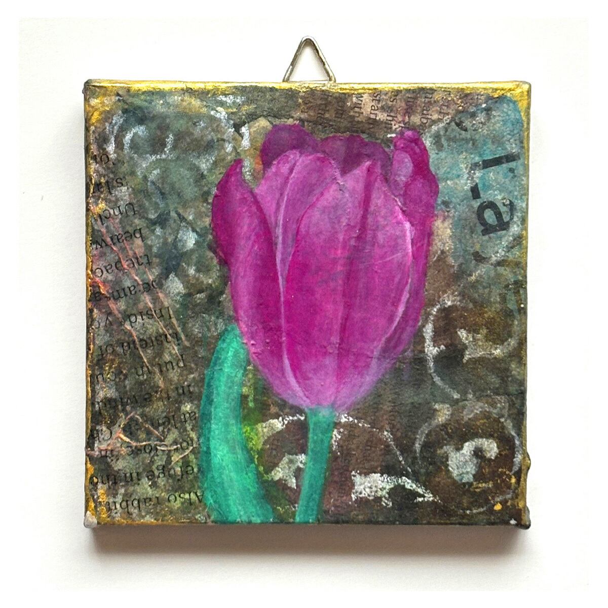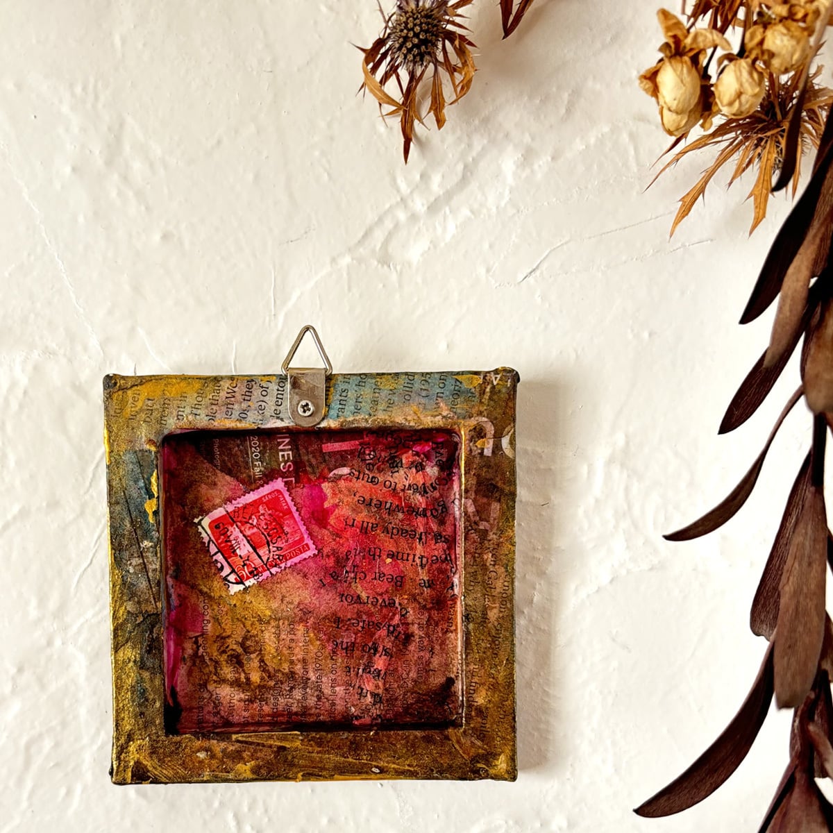 10cm角のキャンバスに、英字のペーパーをコラージュして着色。