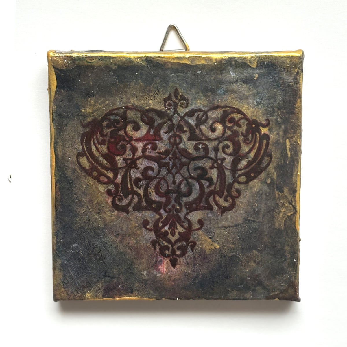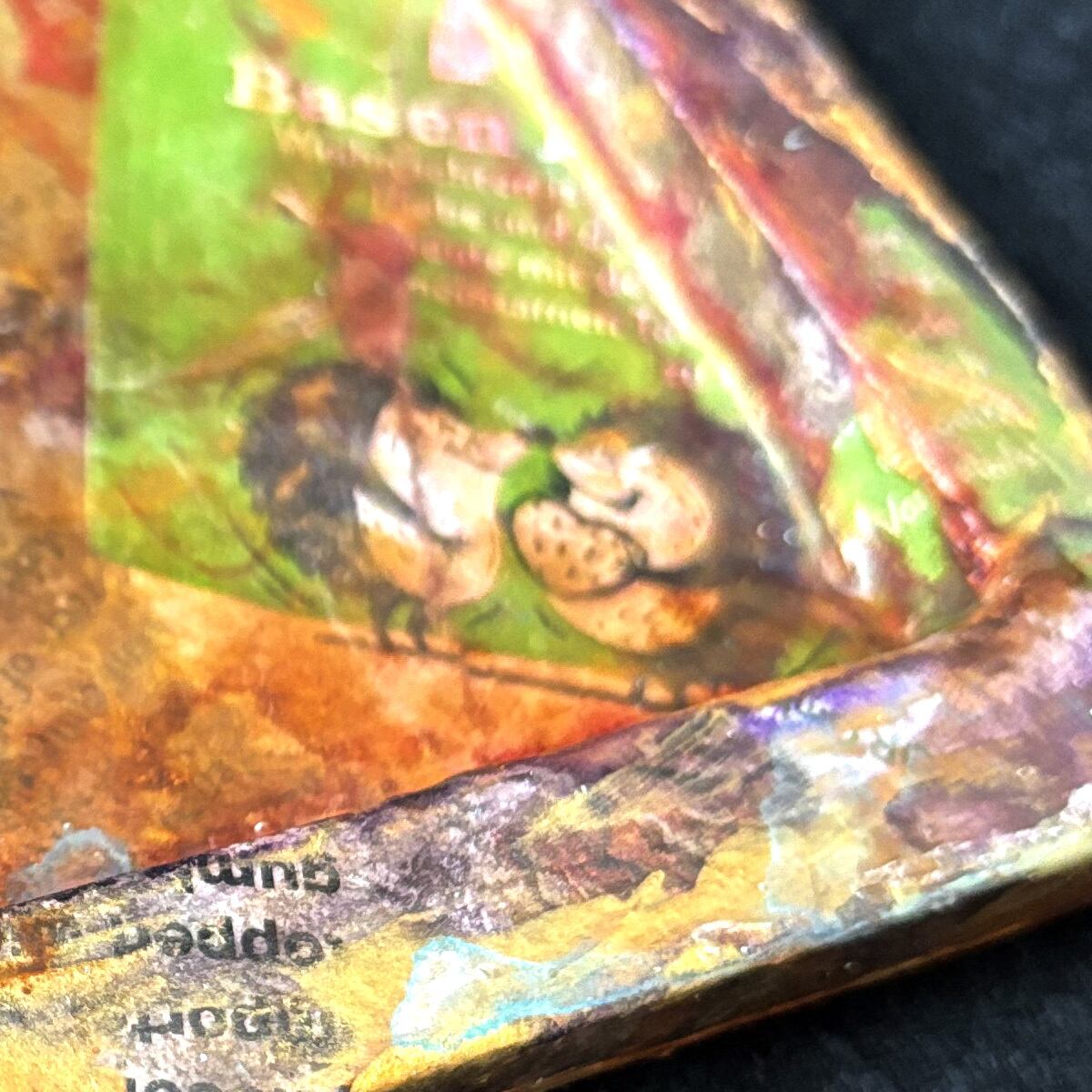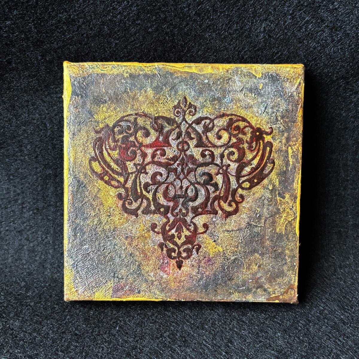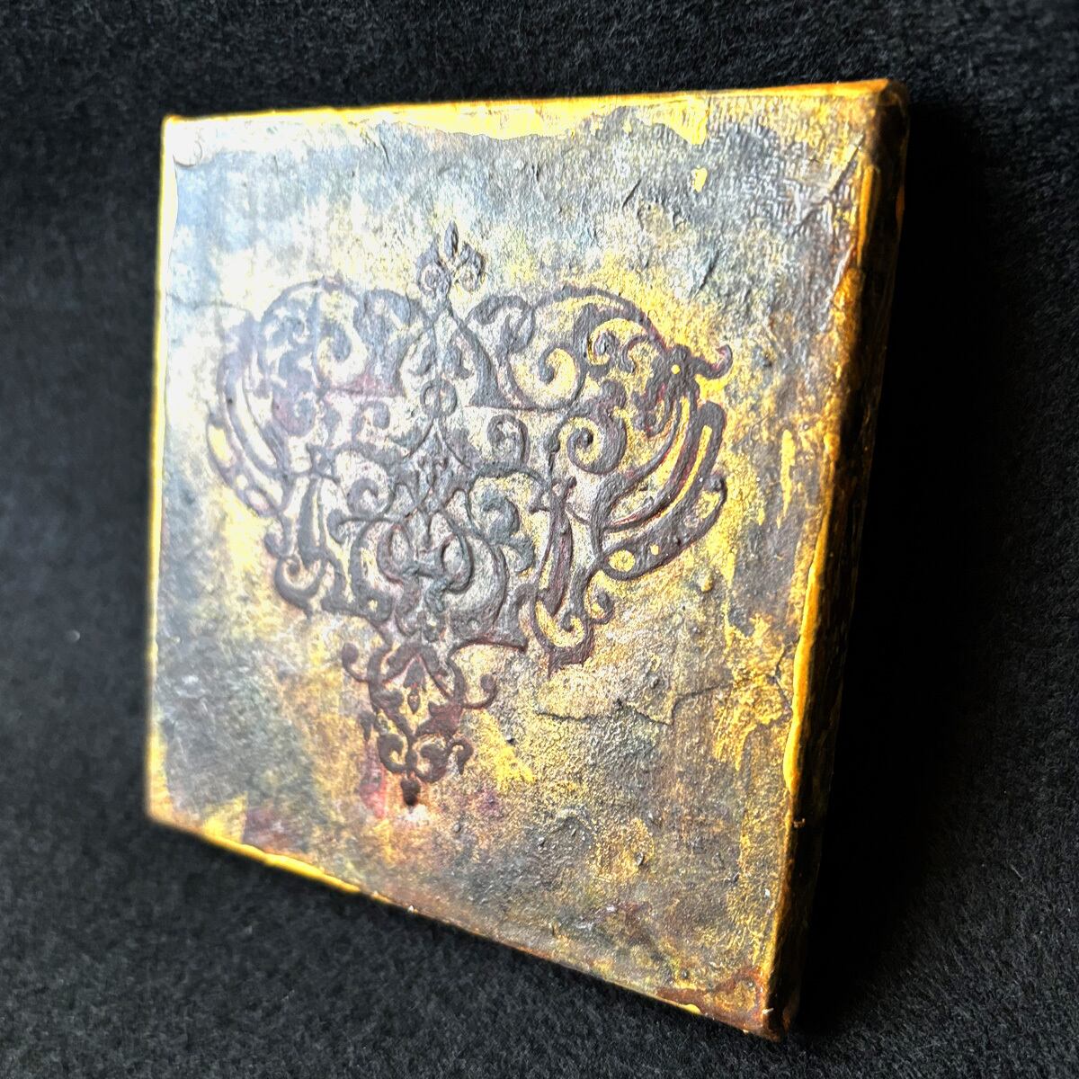 インクや絵の具やゴールド系などのメディウムで汚れや風合いを出し、アンティーク風に仕上げました。