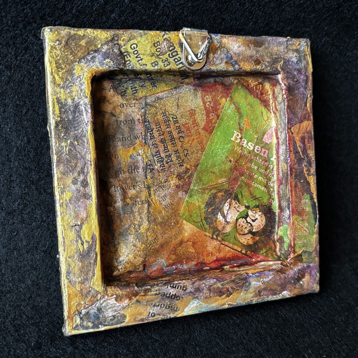 小さなキャンバスを、英字新聞や雑誌などでコラージュし、アンティーク風にしました。