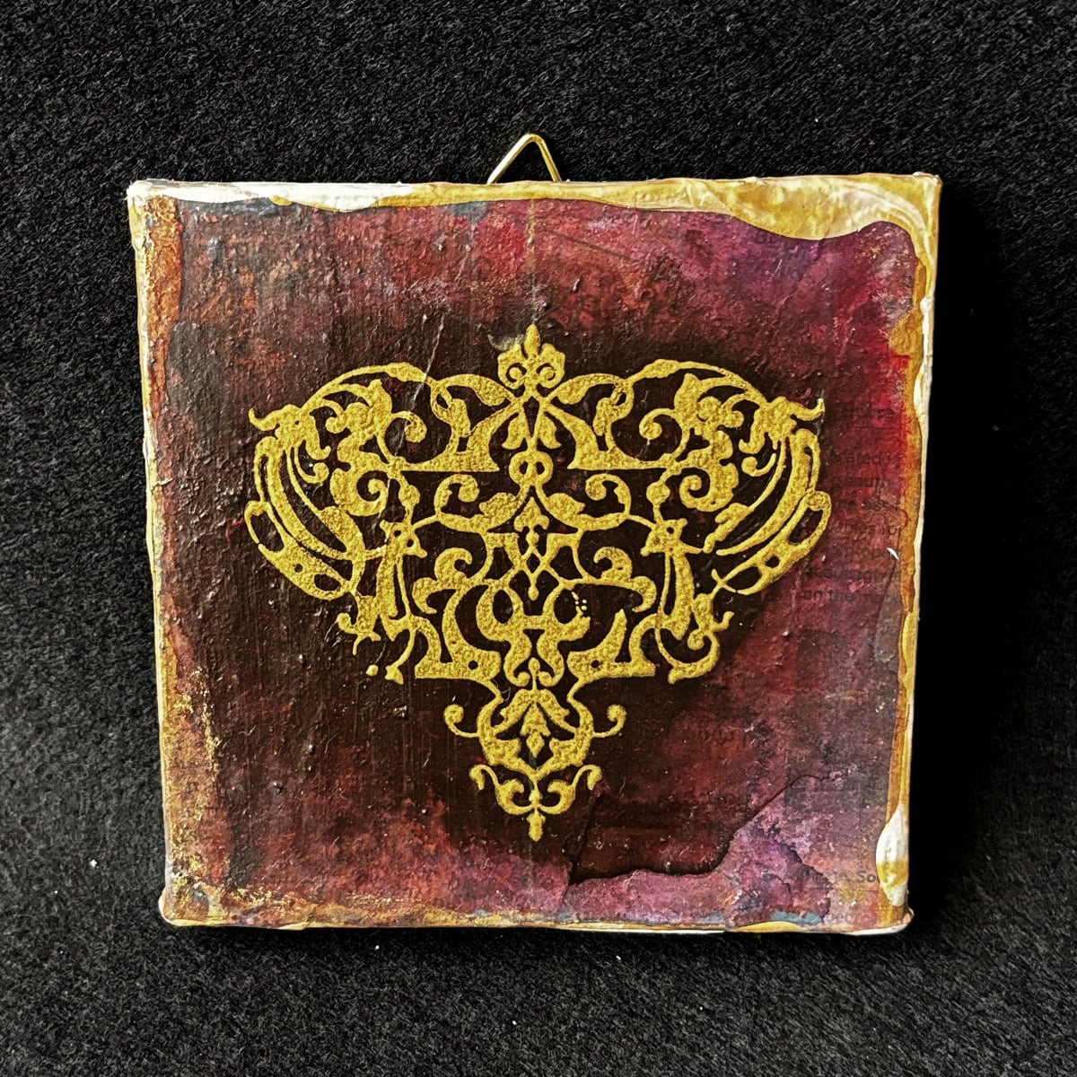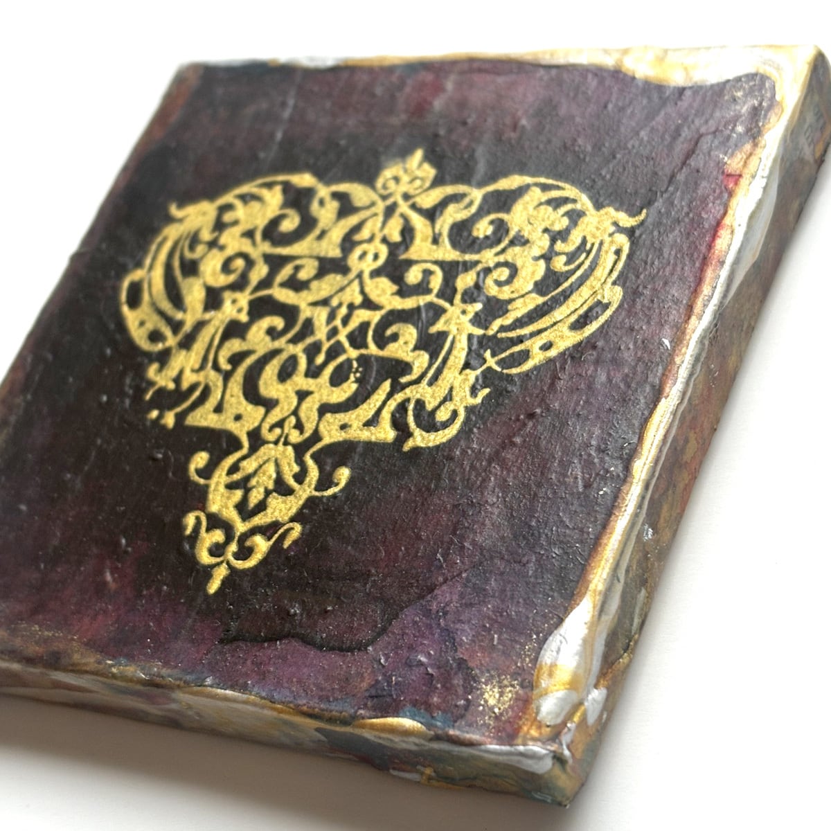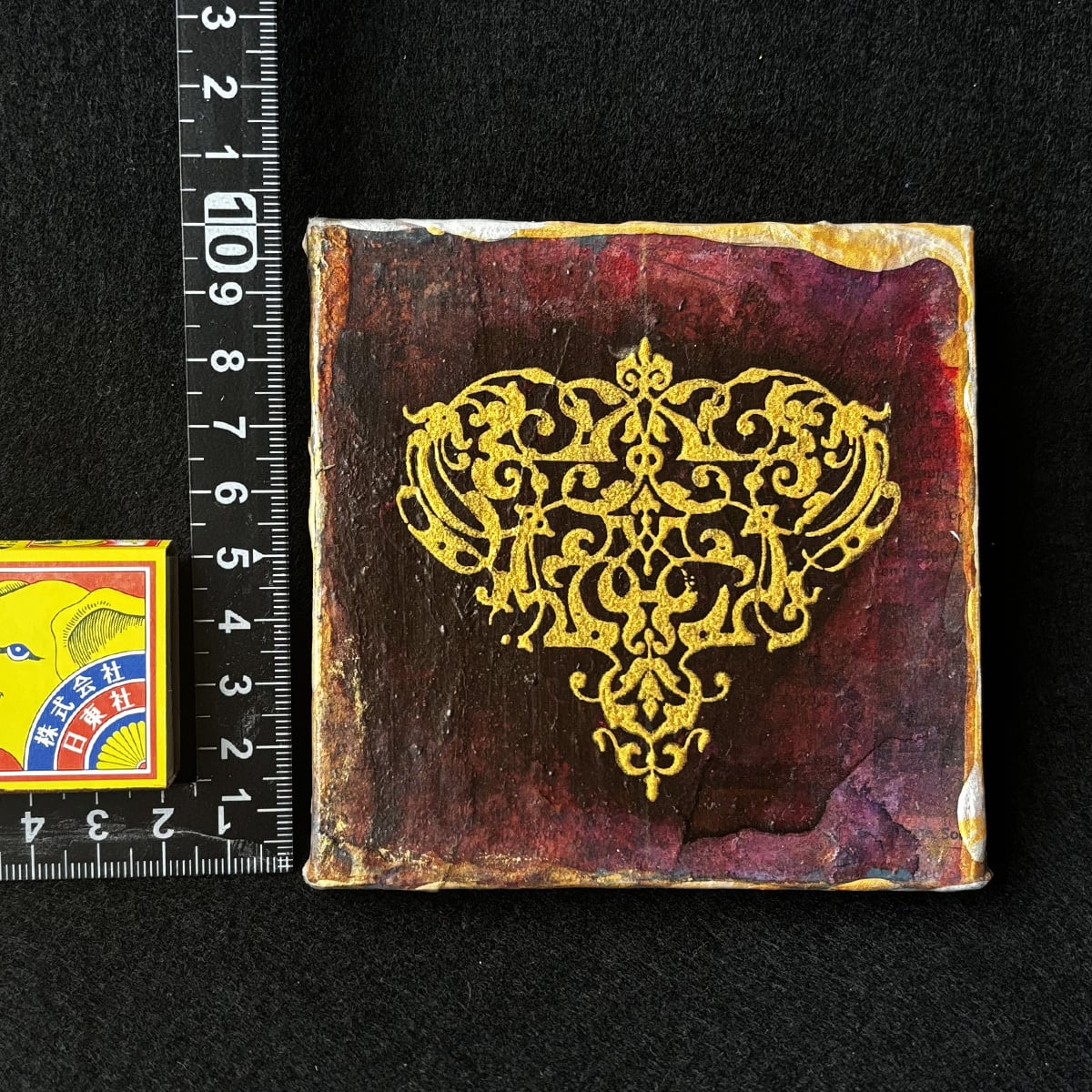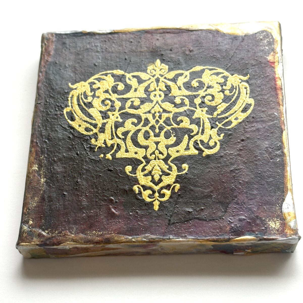 インクや絵の具やゴールド系などのメディウムで汚れや風合いを出し、独特の味わい深い雰囲気になっています。