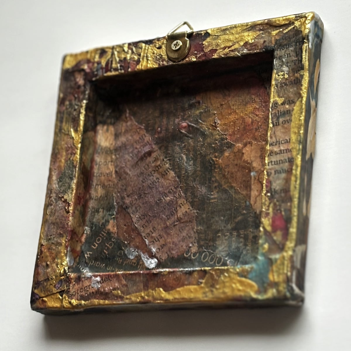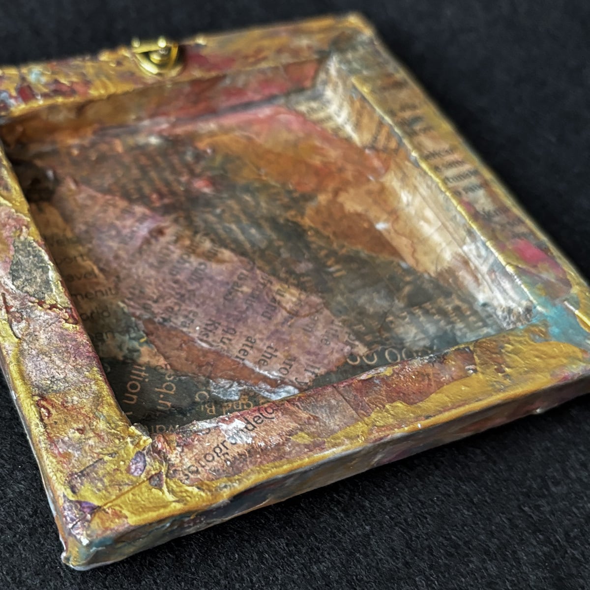小さなキャンバスを、英字新聞や雑誌などでコラージュし、アンティーク風にしました。