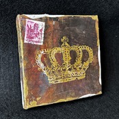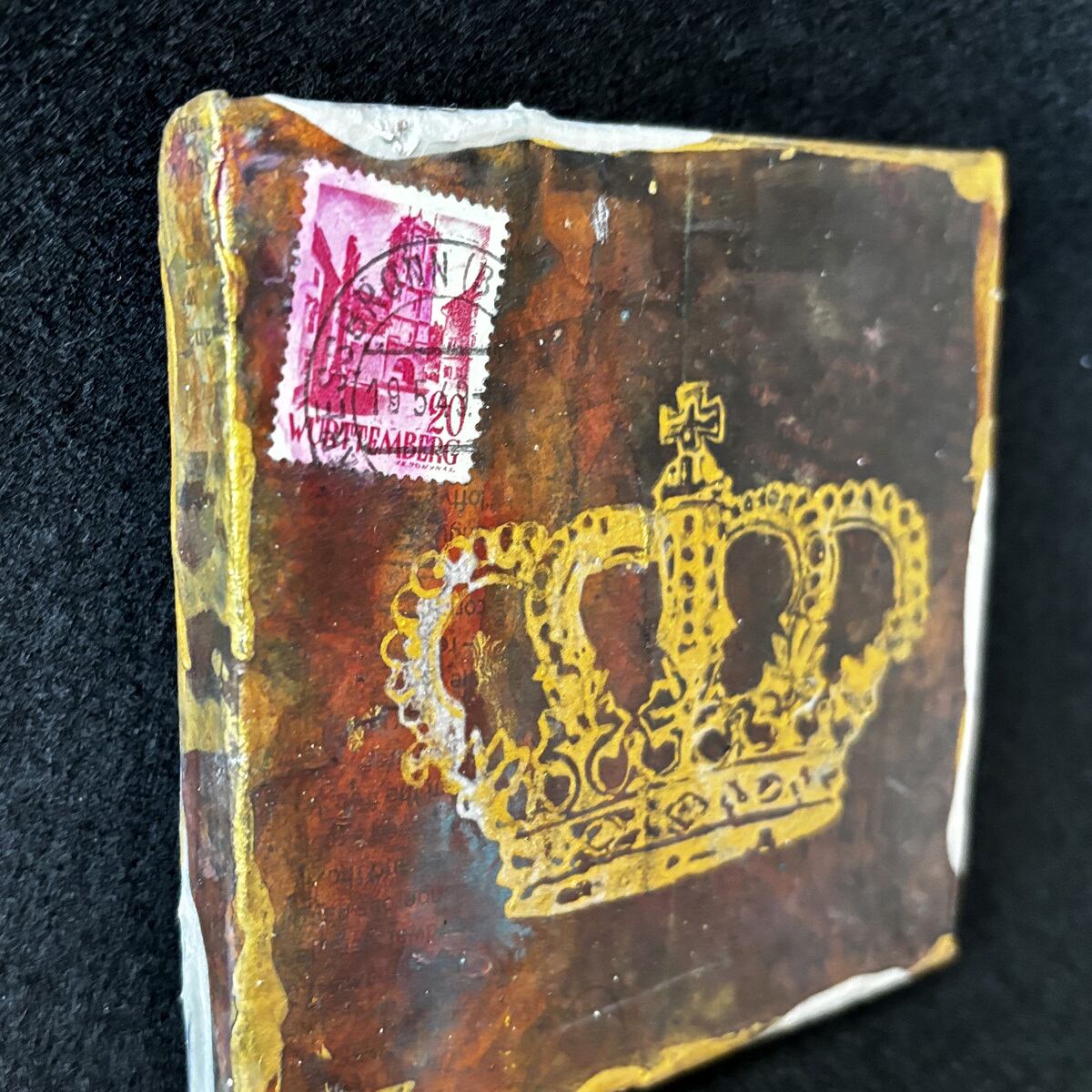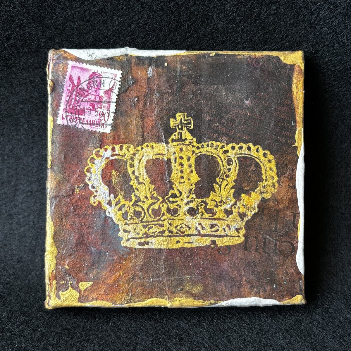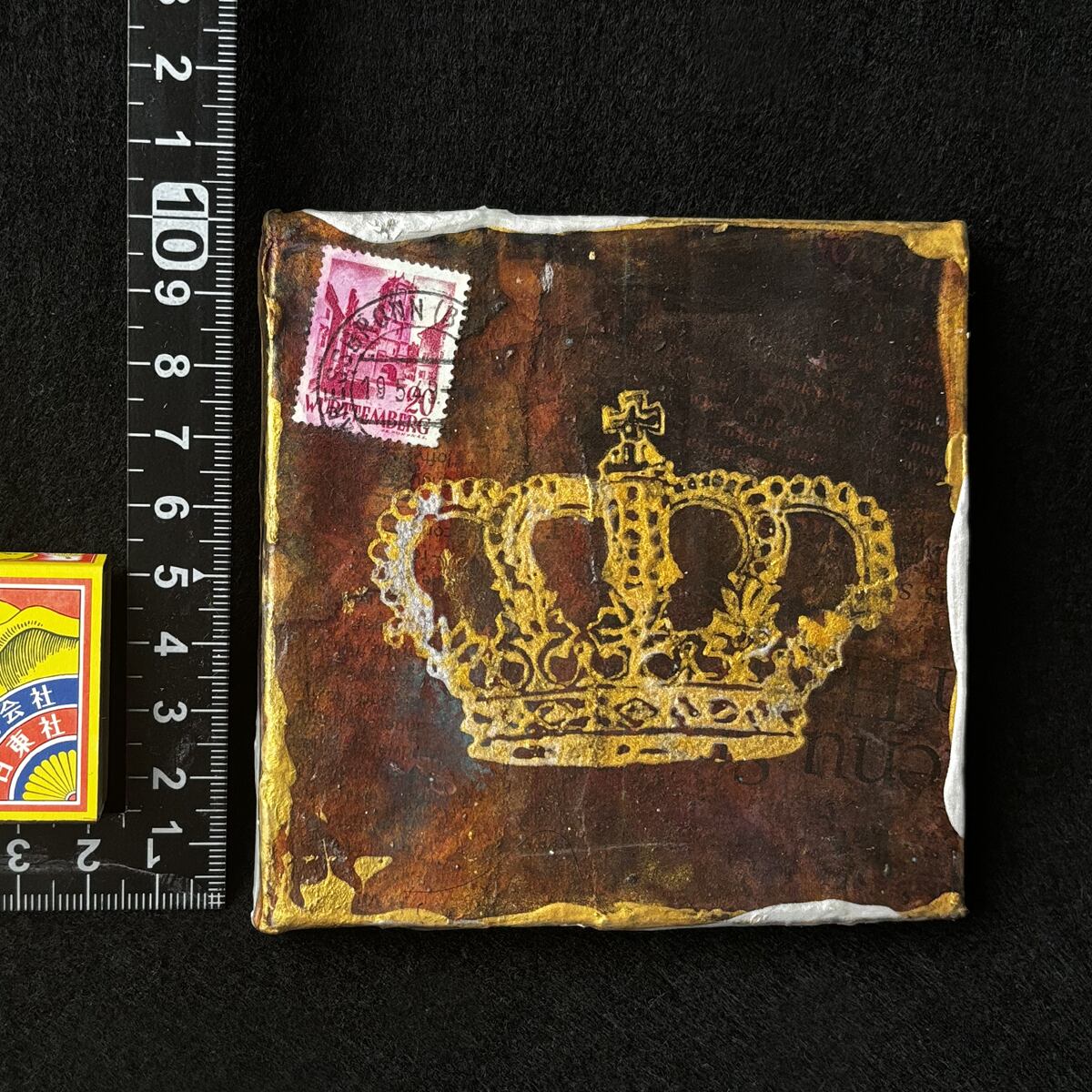 小さなキャンバスを、英字新聞や雑誌などでコラージュし、アンティーク風にしました。