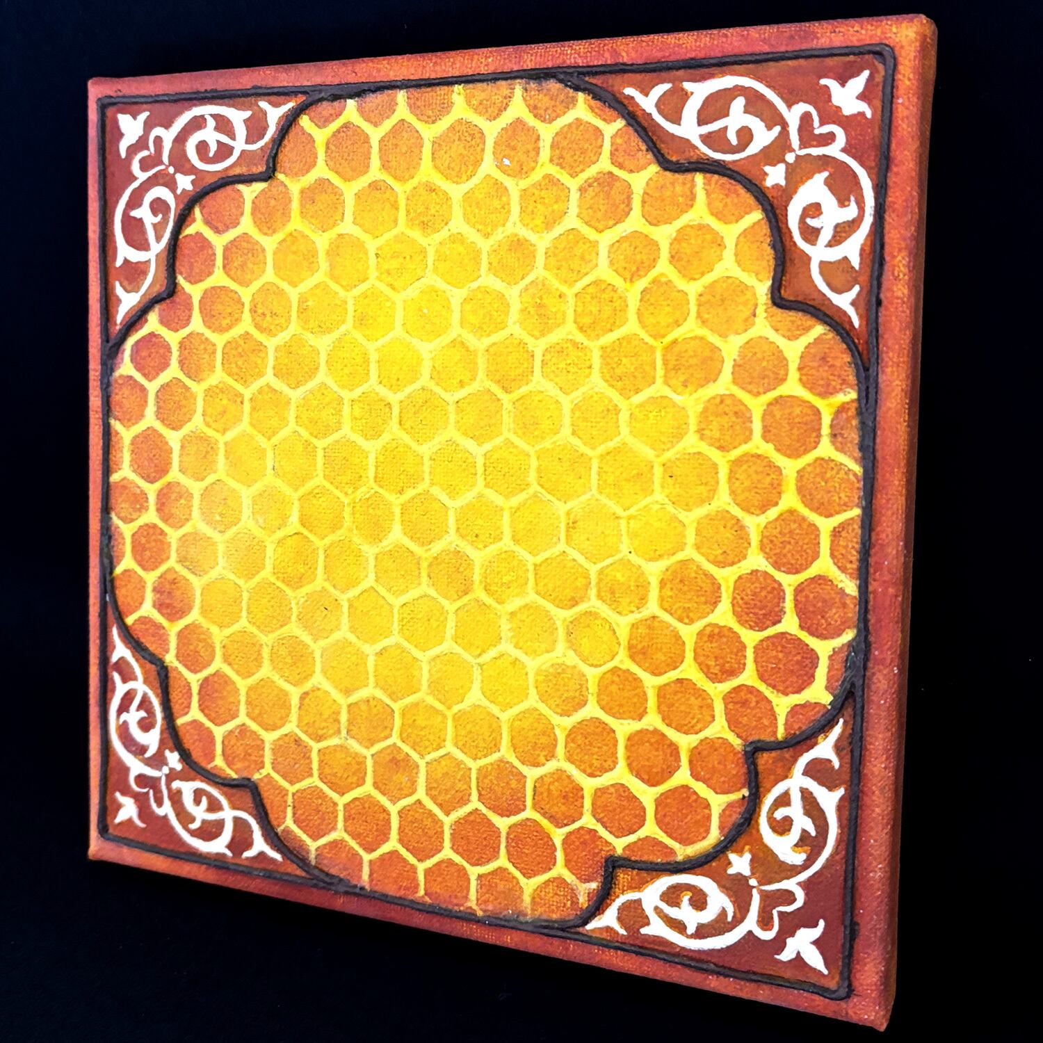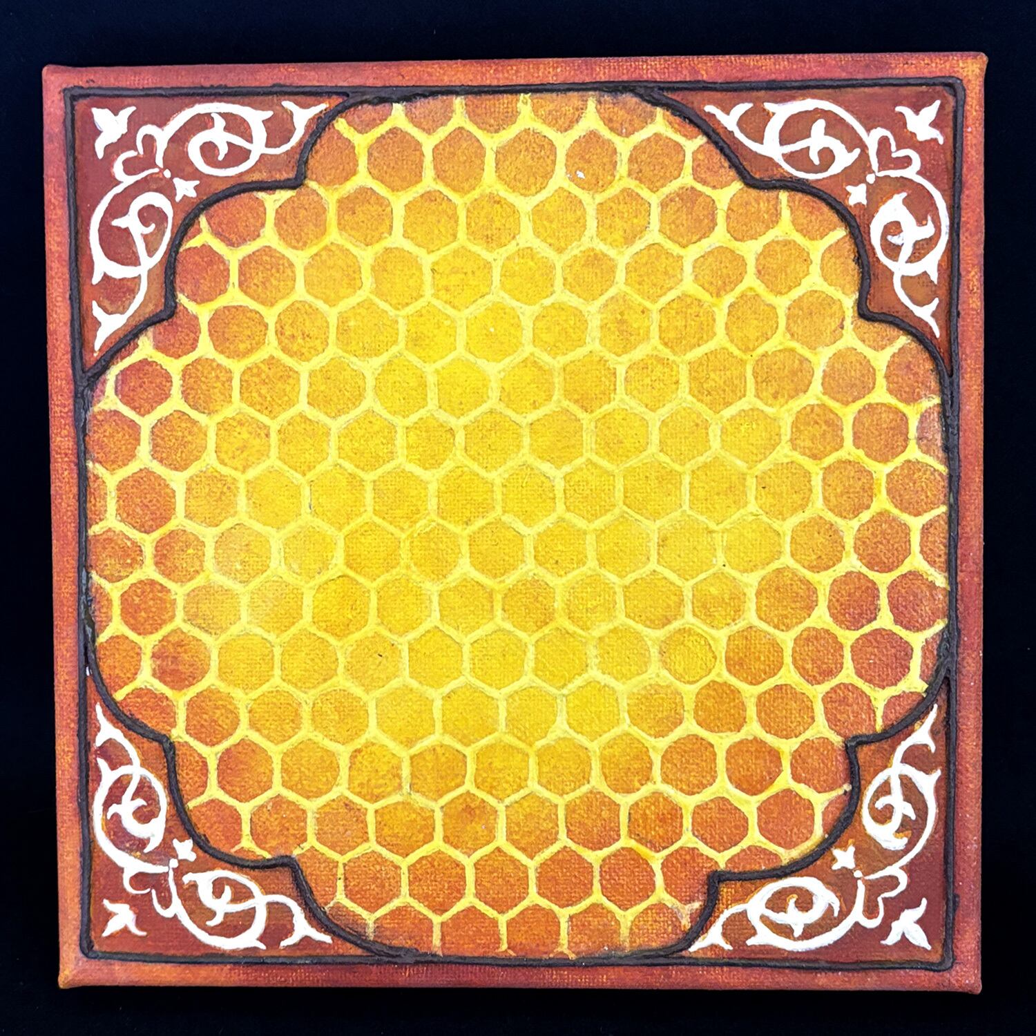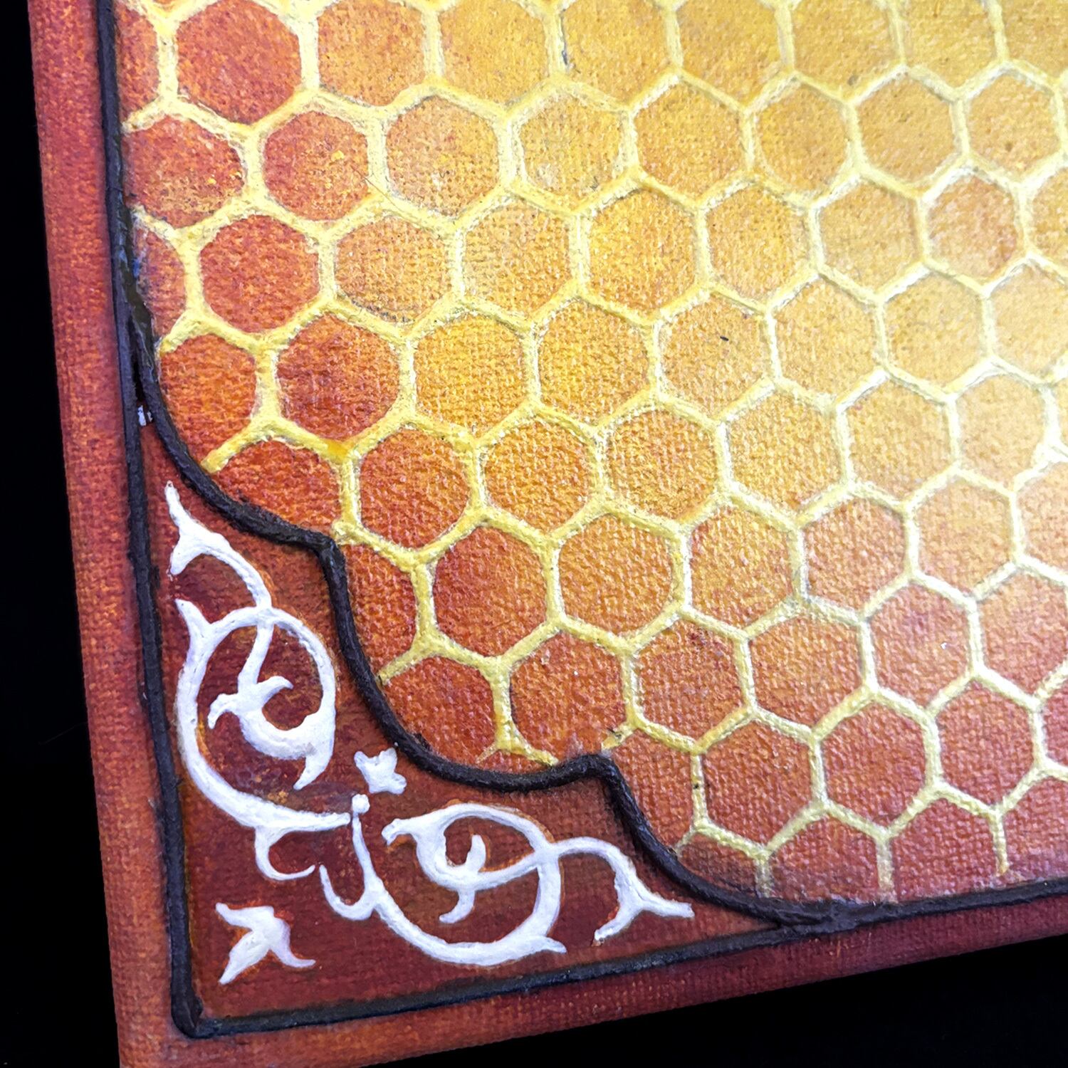 その蜂の巣をキャンバスに敷き詰め、四隅にアラベスクを配置しました。