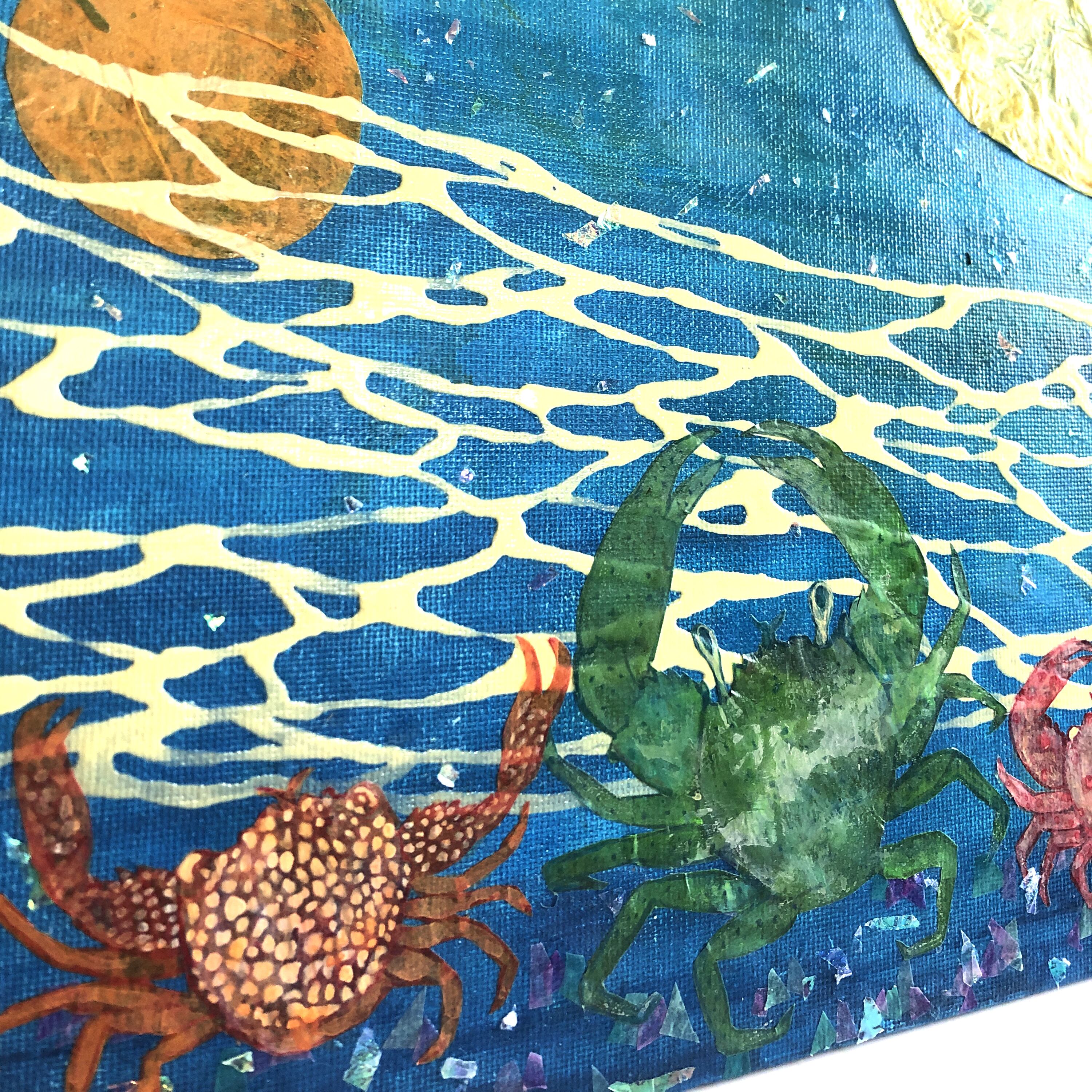 月や、やまなしの実、蟹たちはトレーシングペーパーに彩色して貼り付けてあります。
