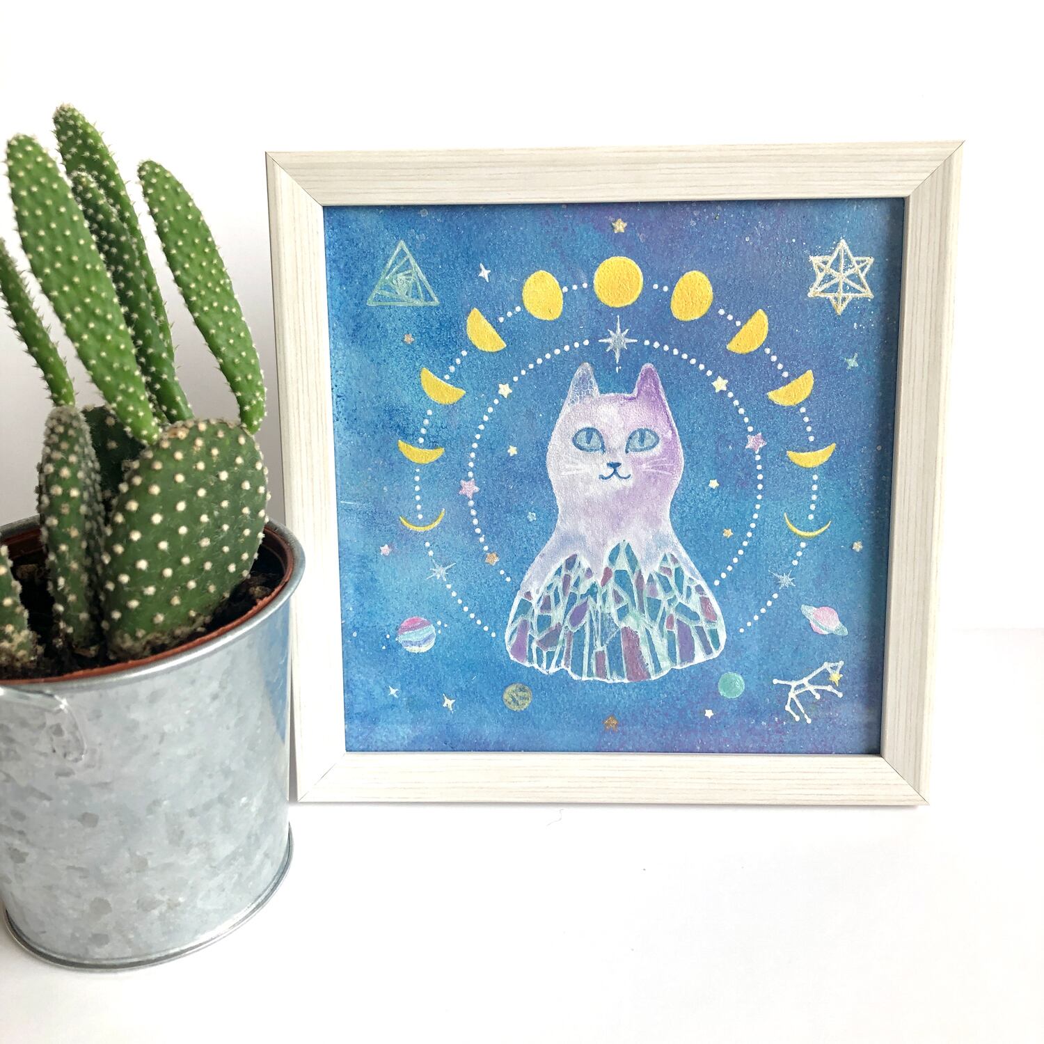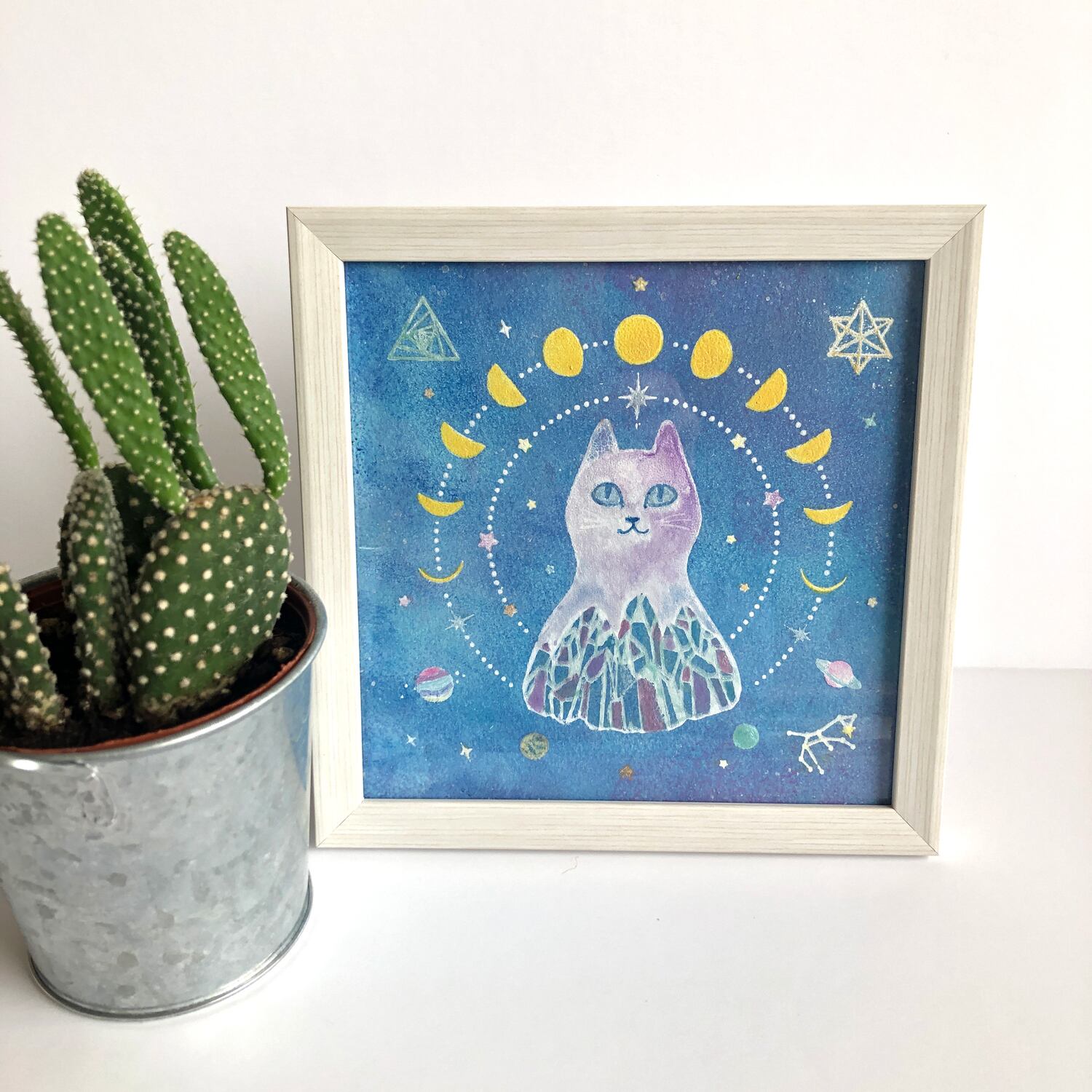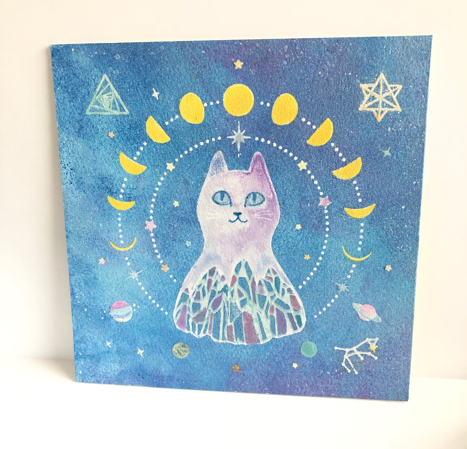 厚さ約1.5mmのキャンバスボードに宇宙を表現し、シルクスクリーン印刷で、猫とクリスタル、天体図を表現しました。