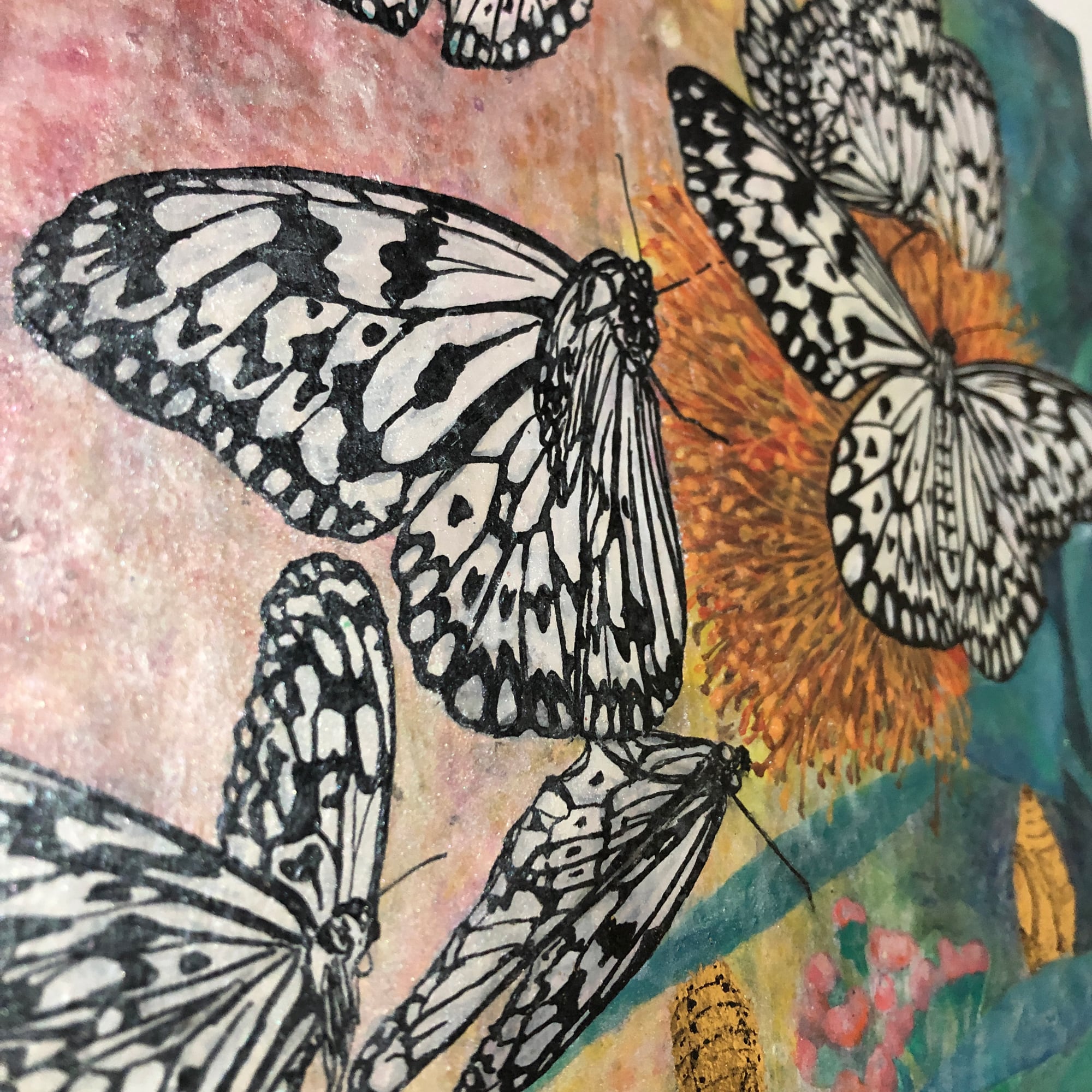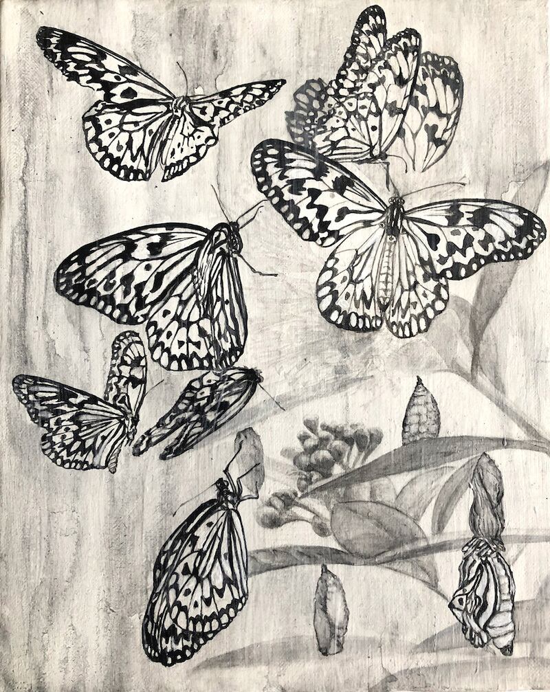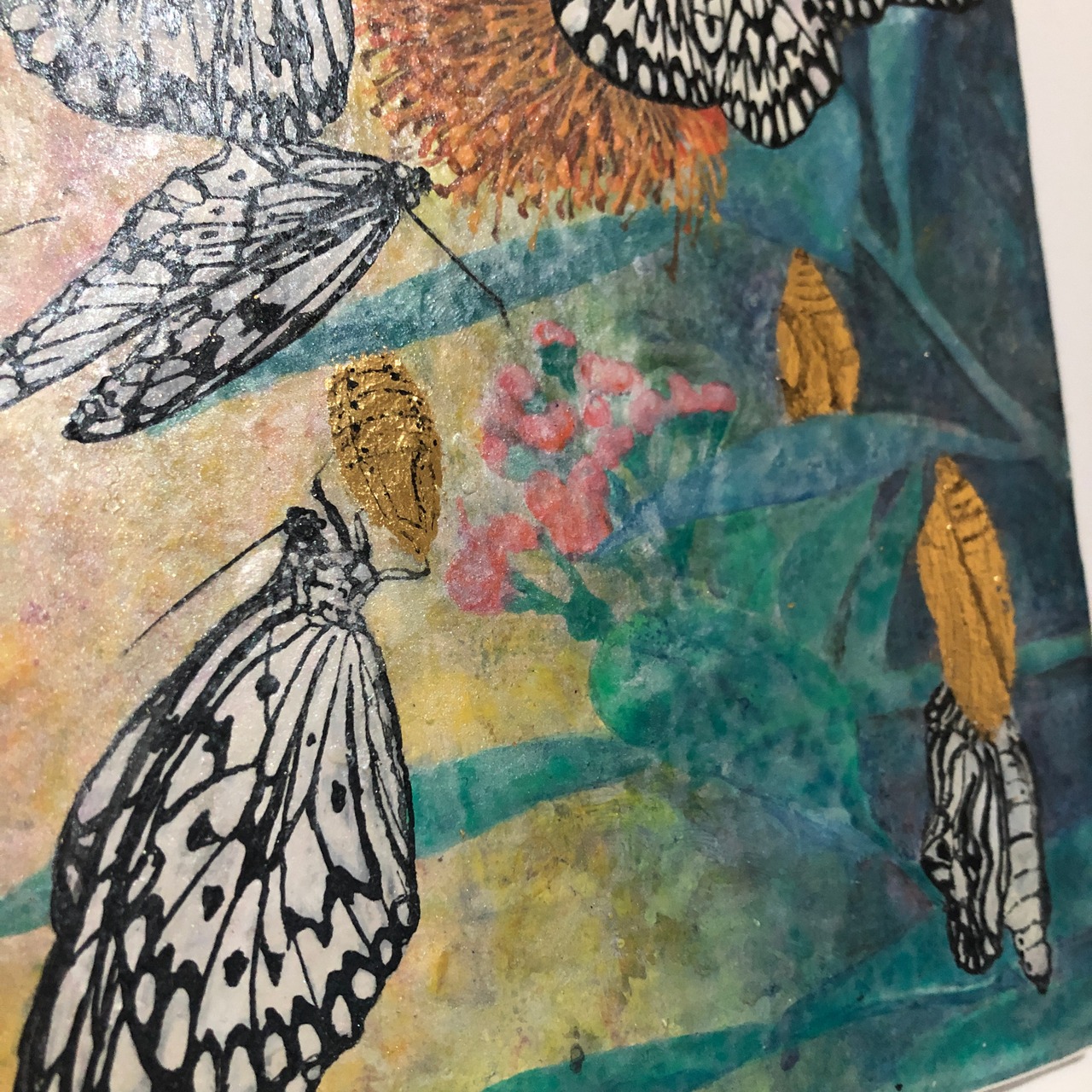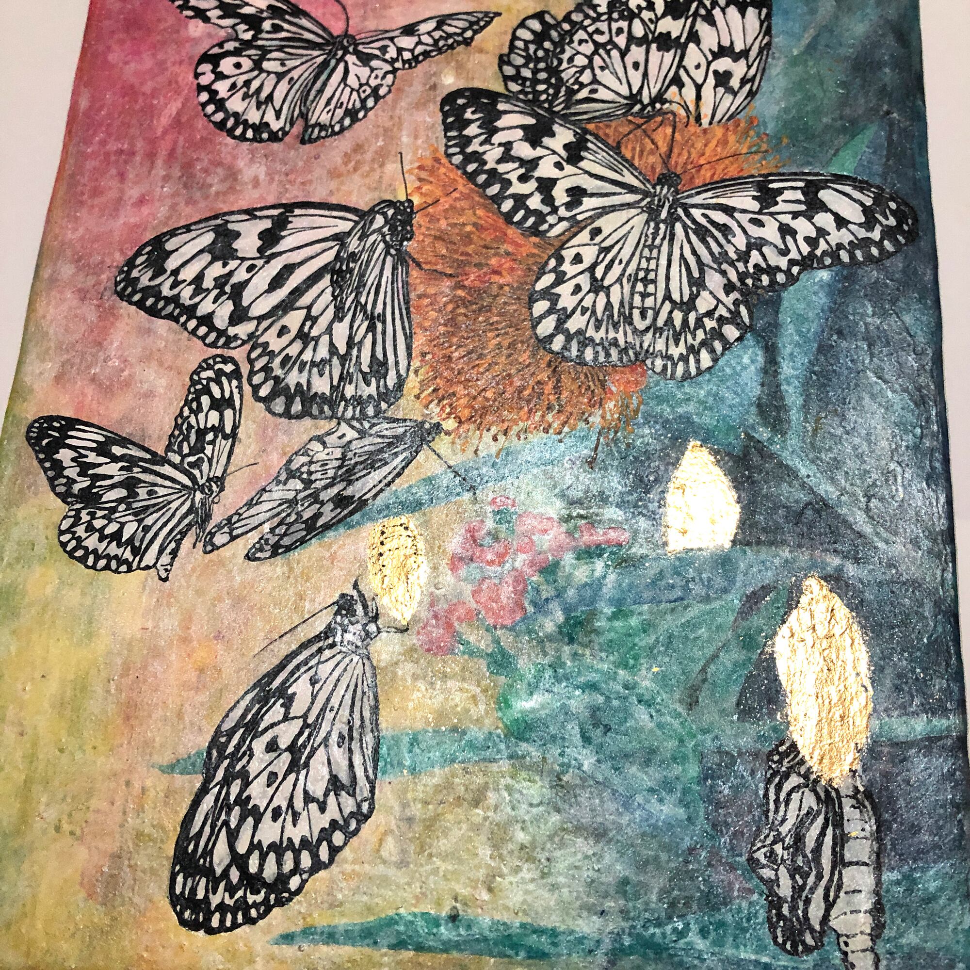 花の蜜に集まった大ゴマダラと、その蛹を描きました。