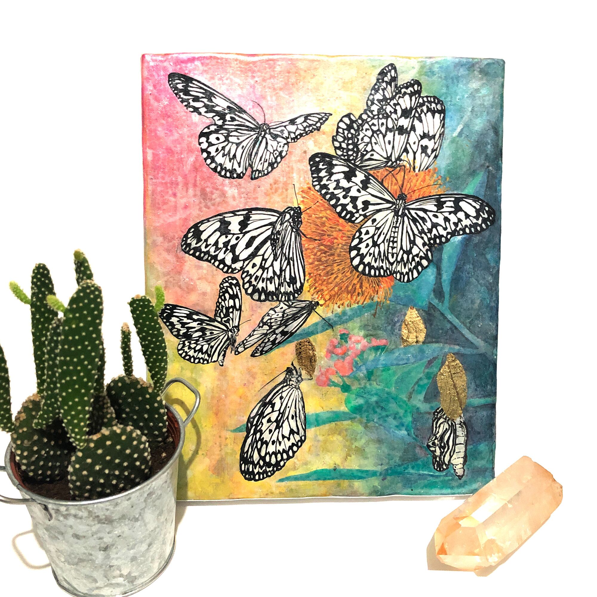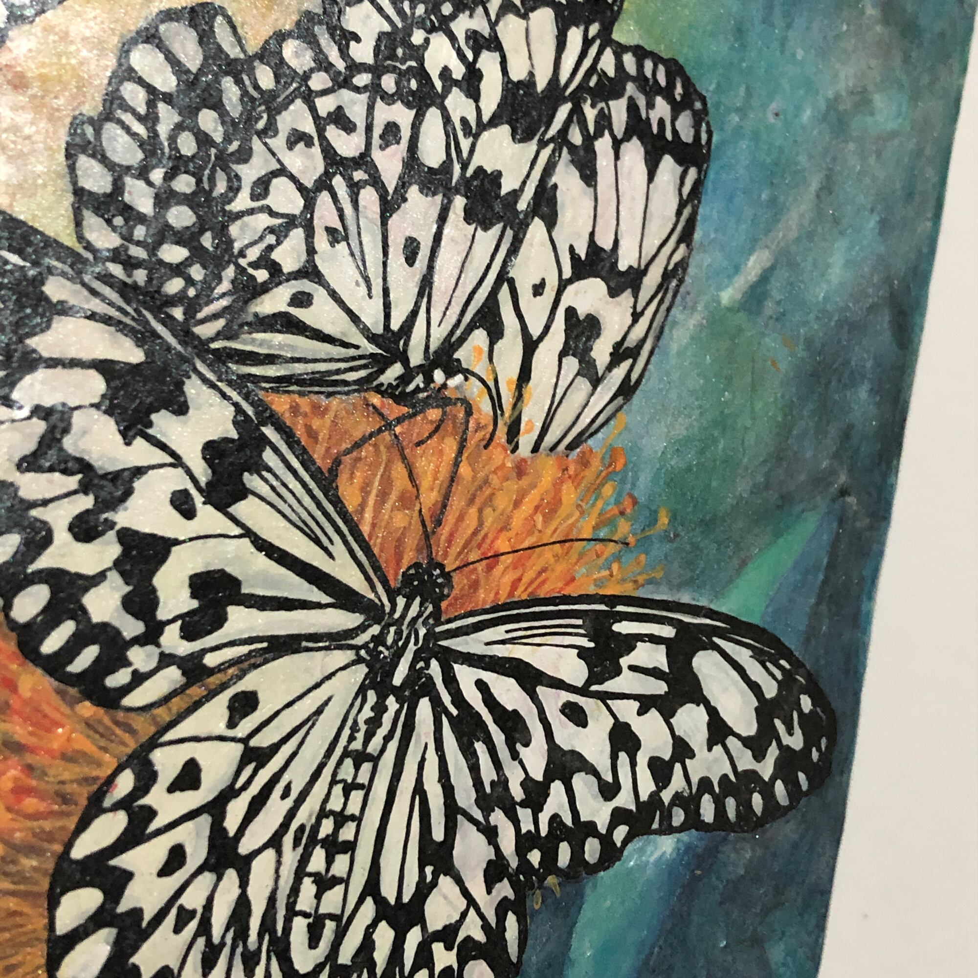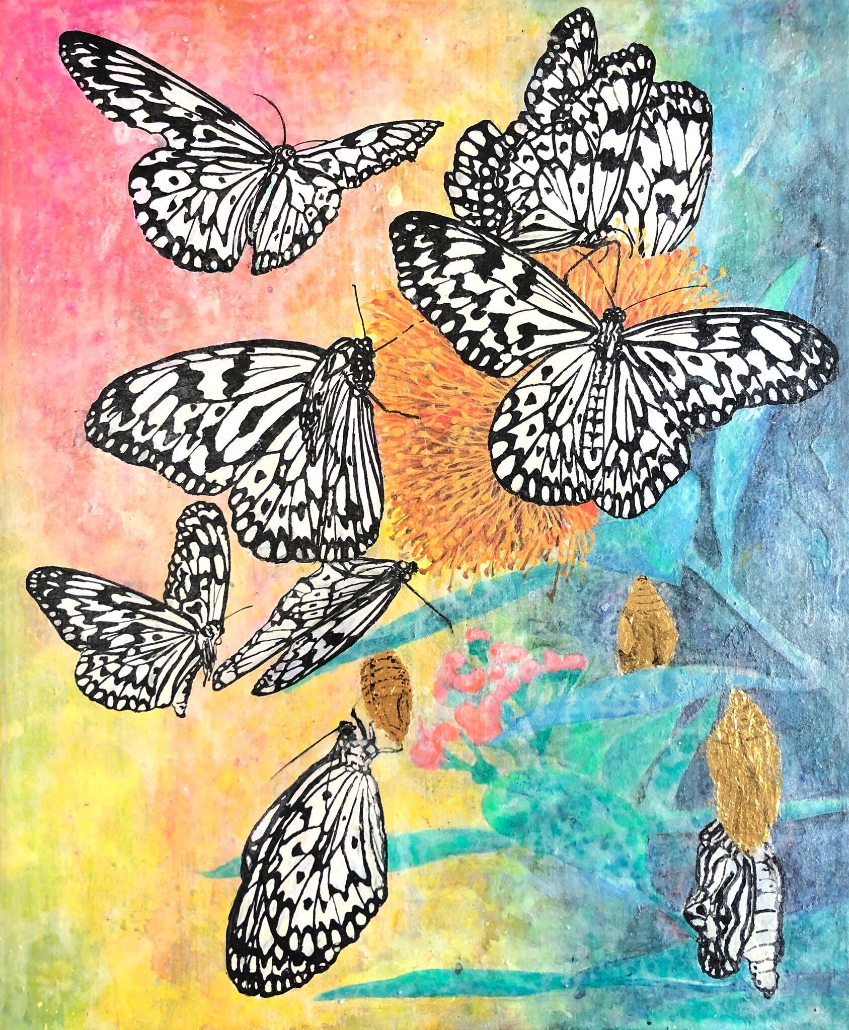 花の蜜に集まった大ゴマダラと、その蛹を描きました。