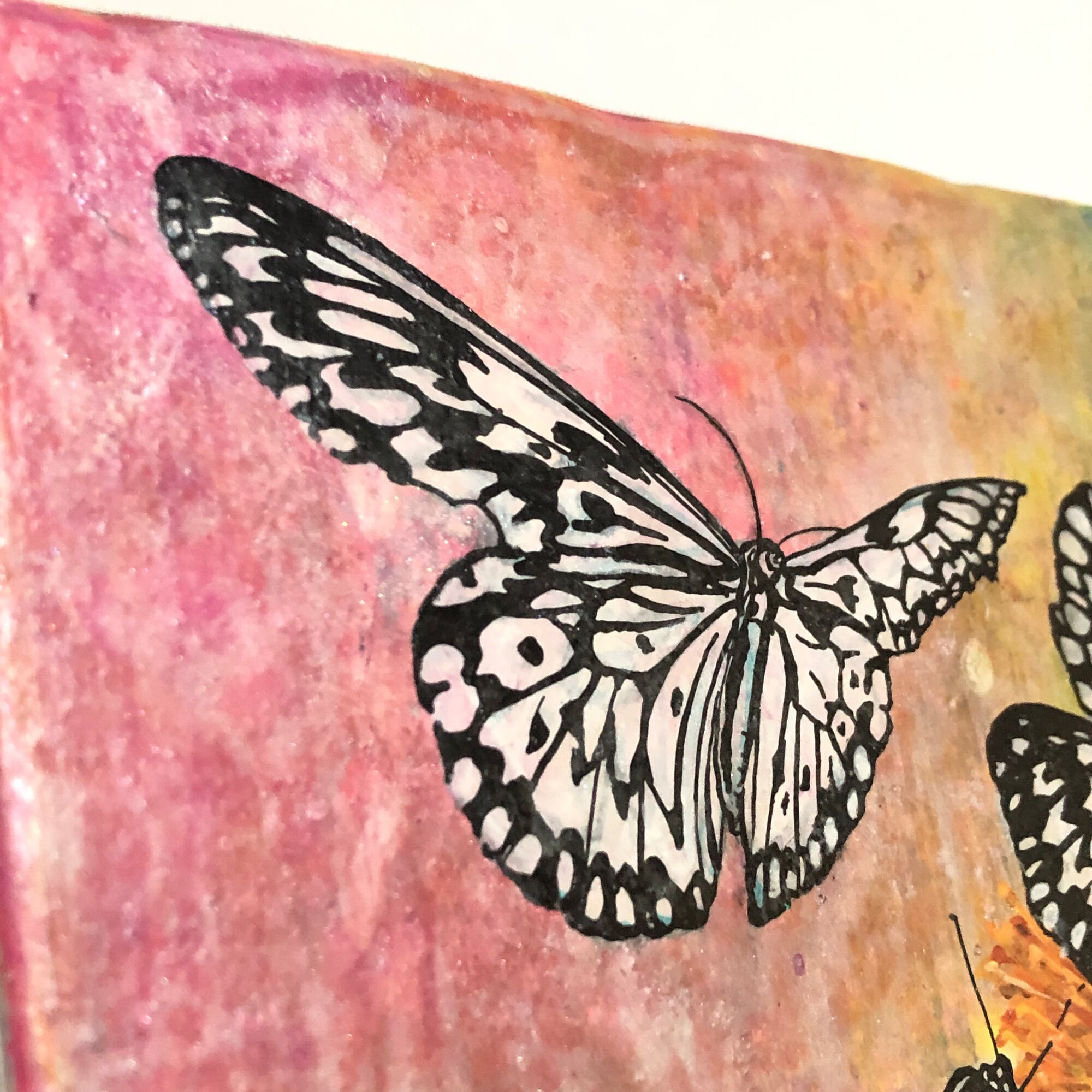 背景の表面には、パールの絵の具でコーティングしています。