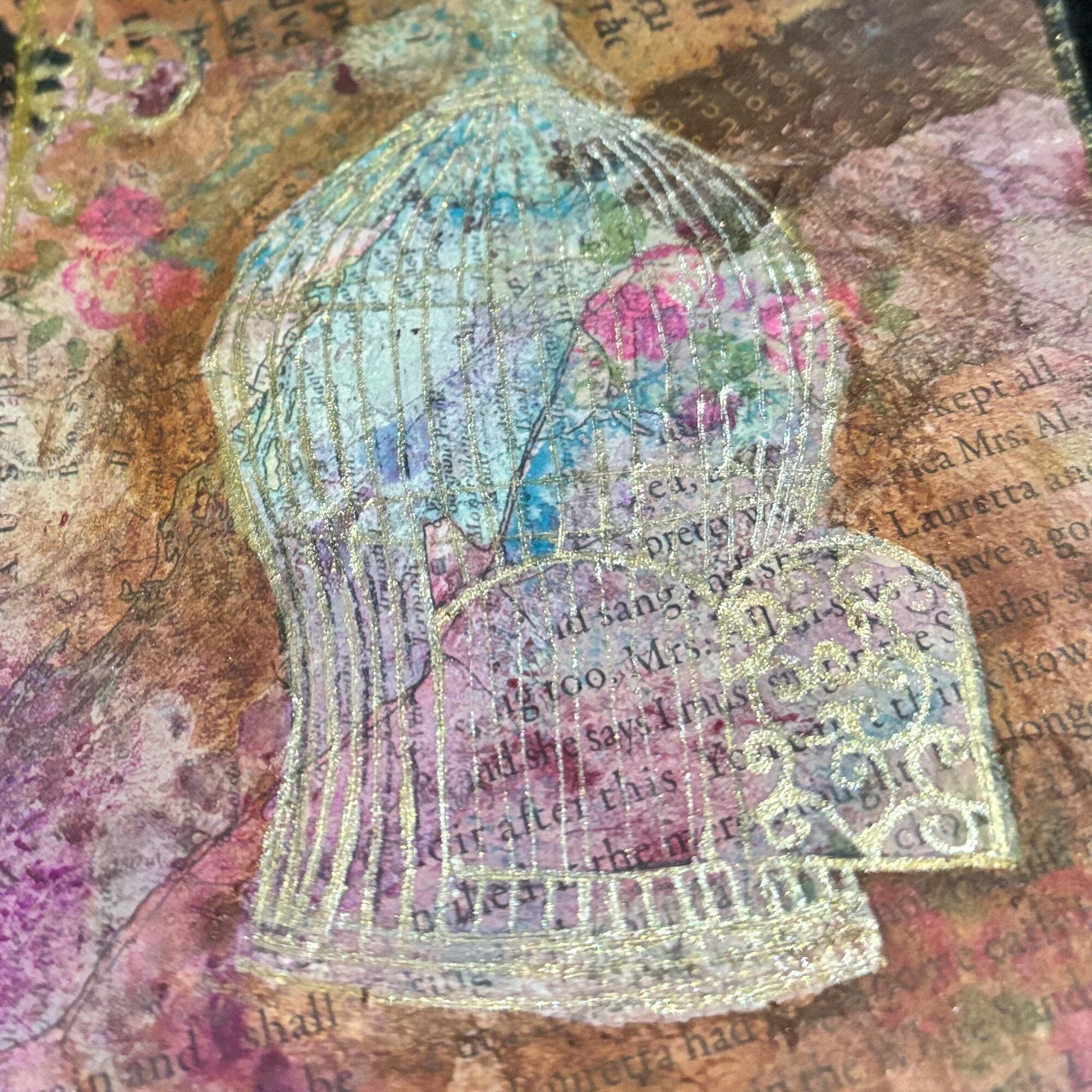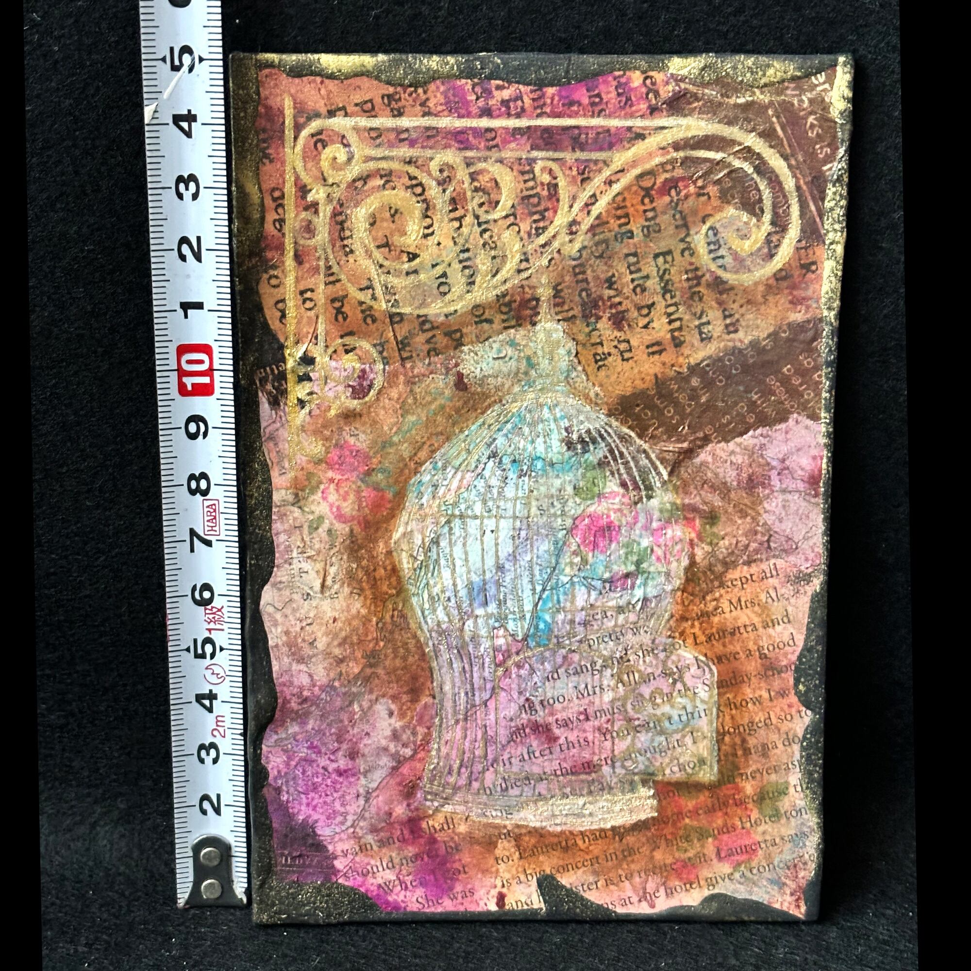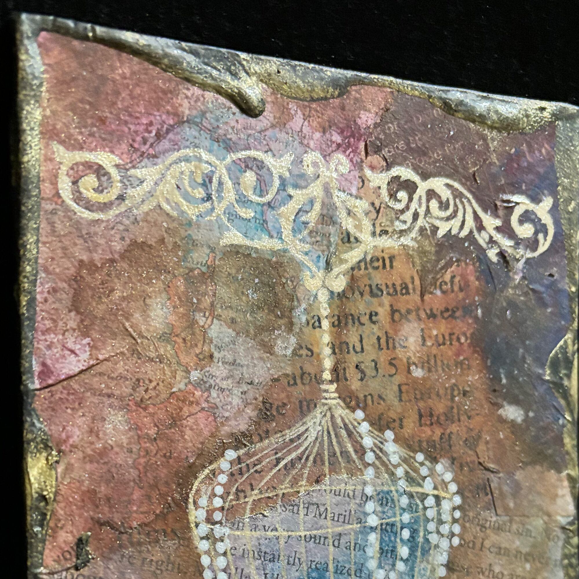厚紙、アクリル絵の具、メディウム、英字新聞、英字雑誌、金粉、エンボスパウダー
