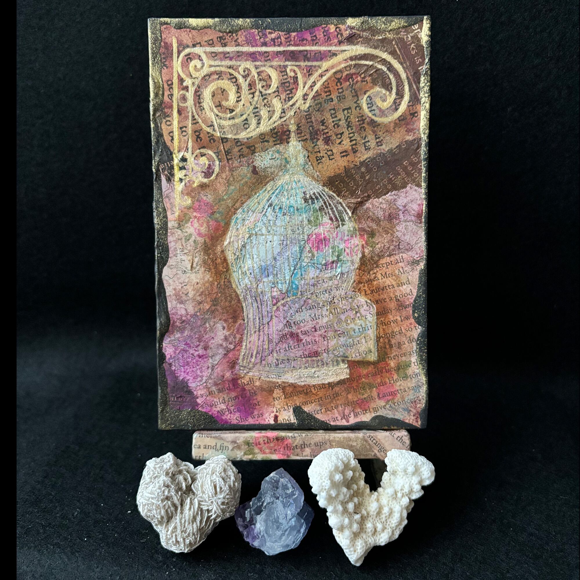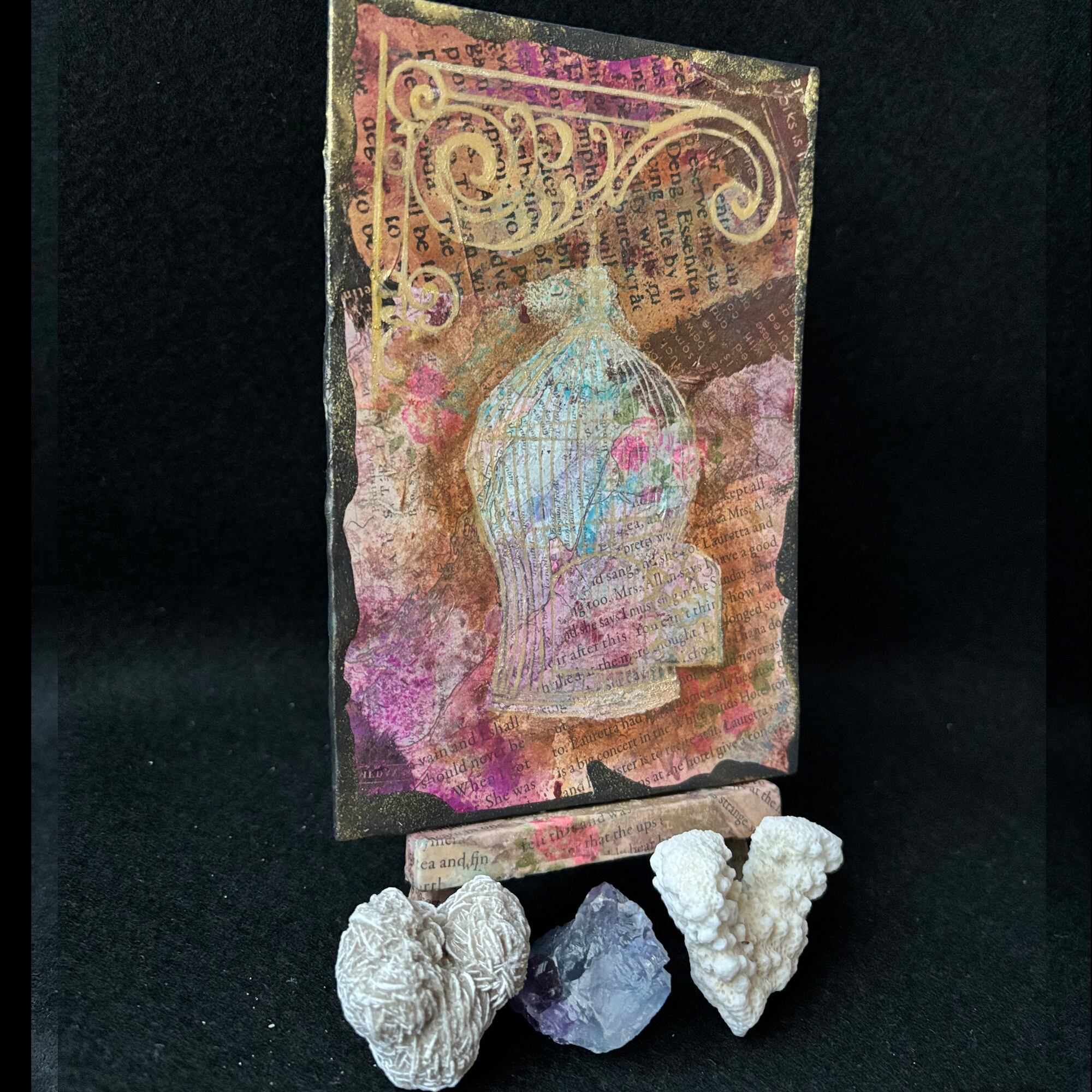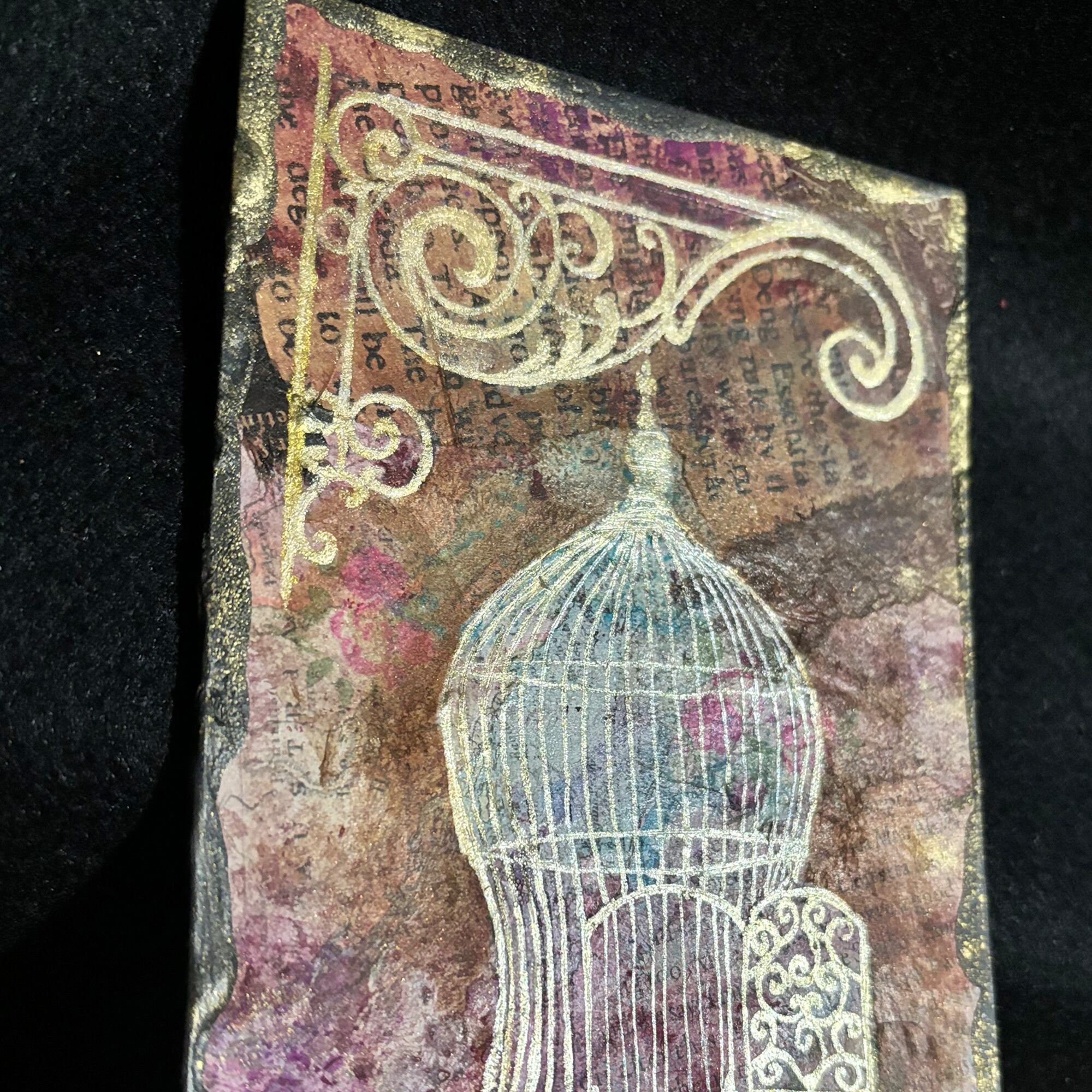 厚紙、アクリル絵の具、メディウム、英字新聞、英字雑誌、金粉、エンボスパウダー