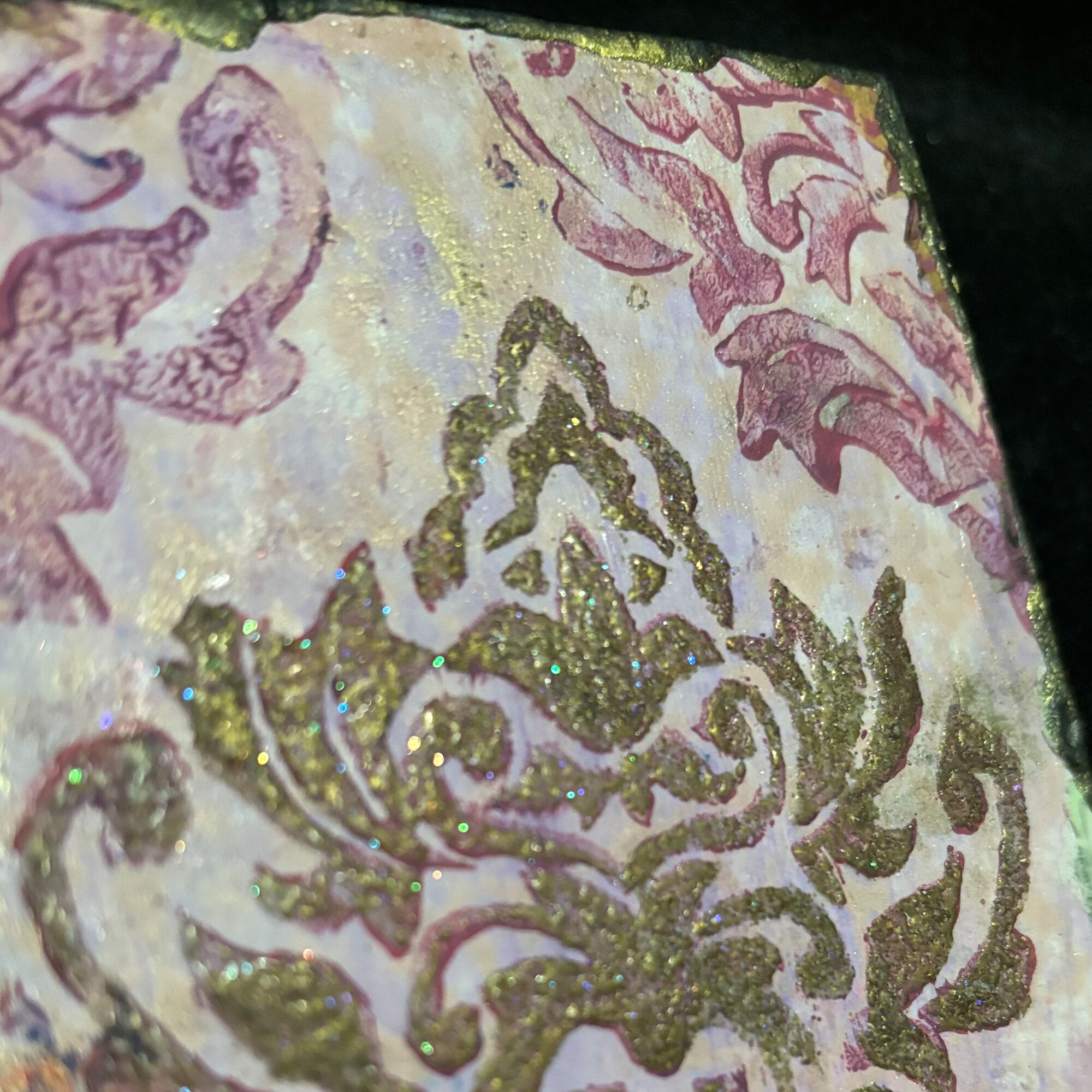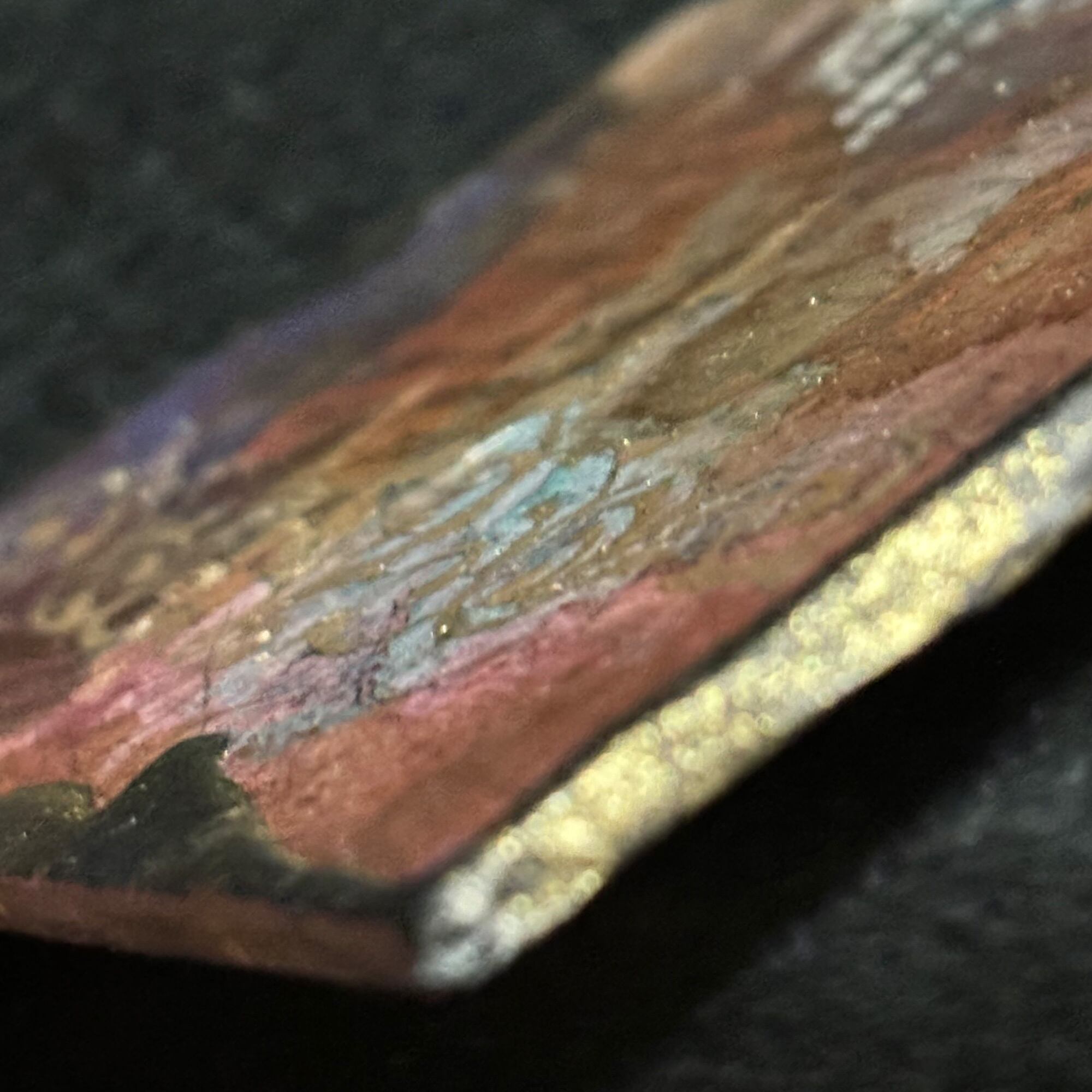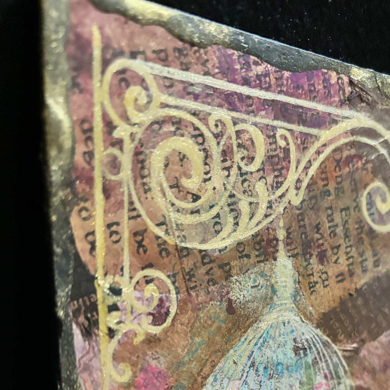 メディウムで縁をコーティングし、金粉を施すことによって、チョコレートソースが垂れてくるようなスィーツっぽい風合いも楽しめます。
