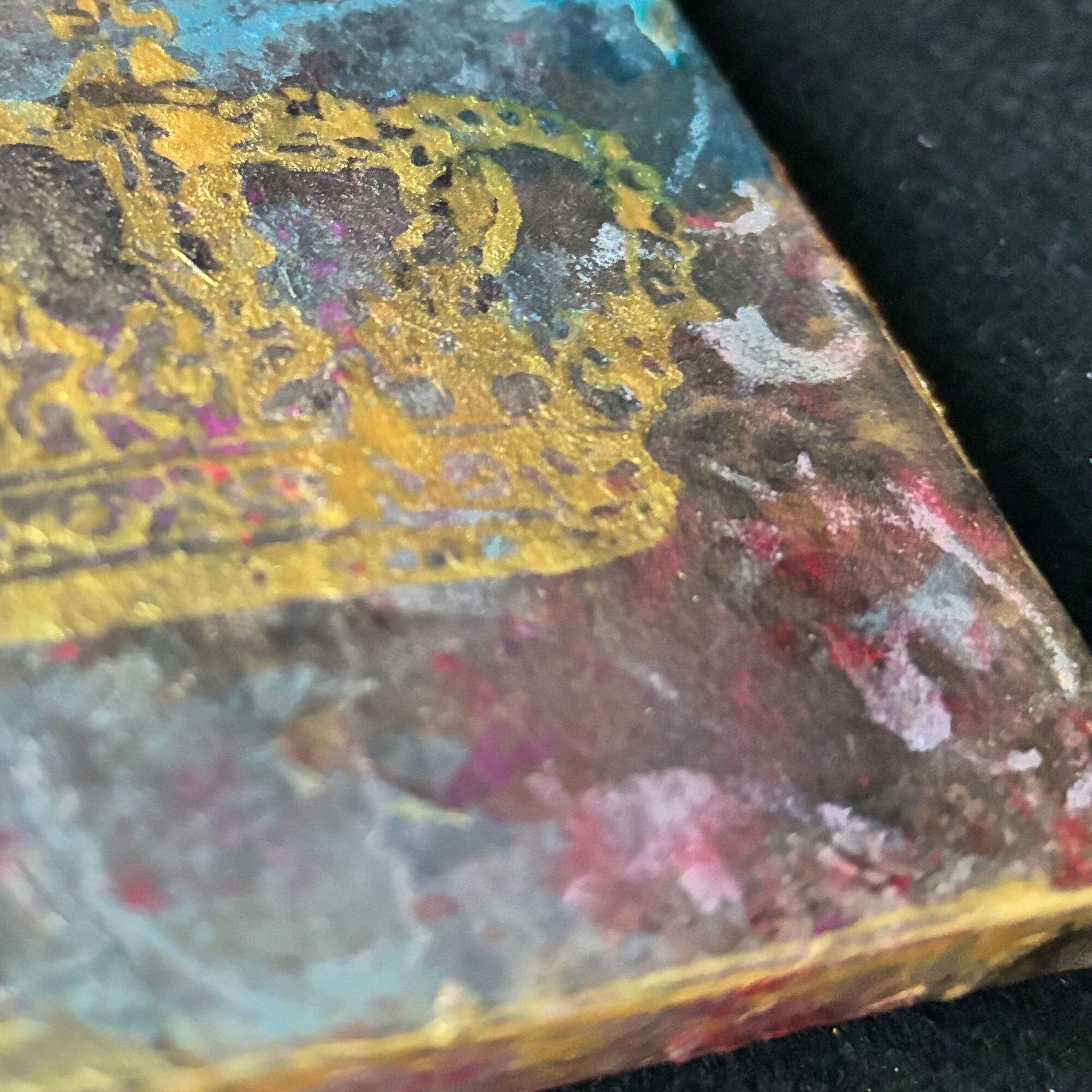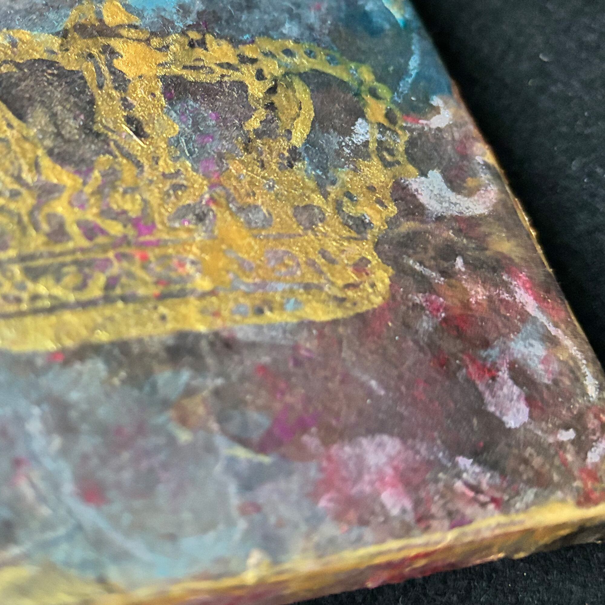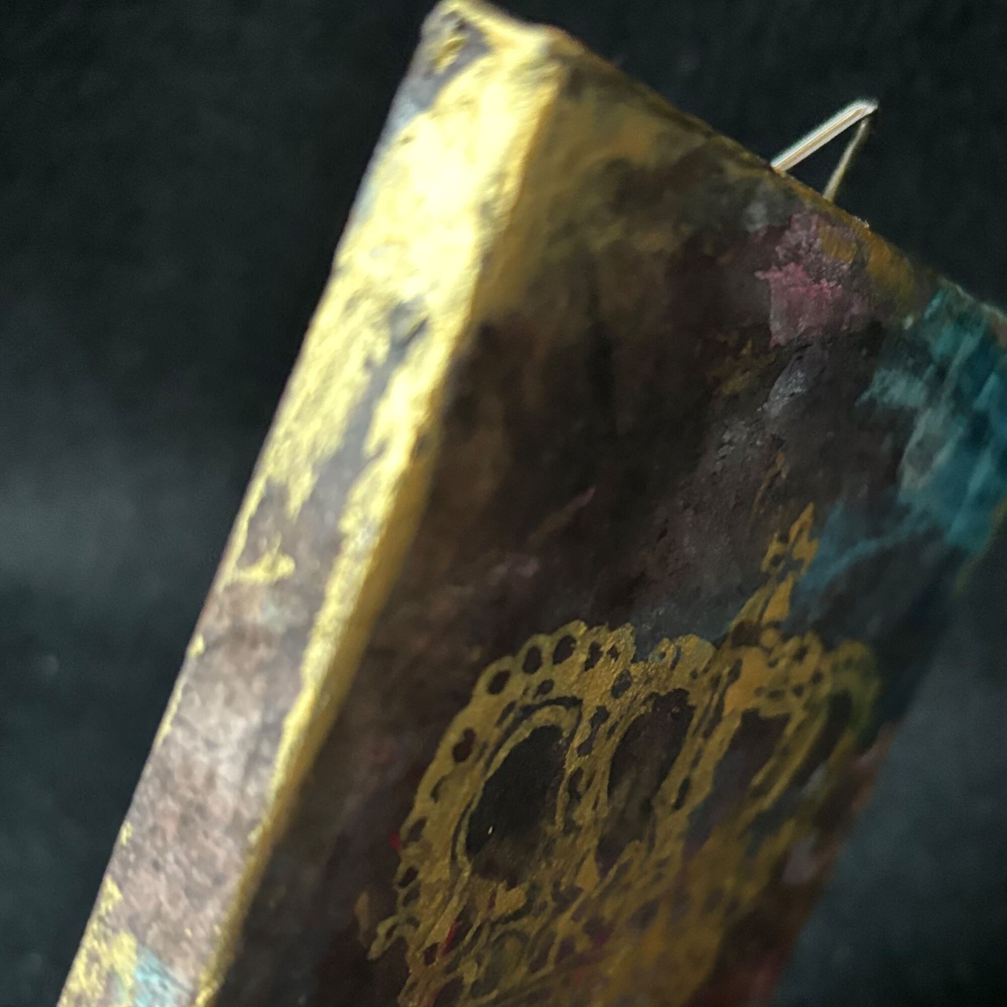 インクや絵の具やゴールド系などのメディウムで汚れや風合いを出し、アンティーク風に仕上げました。