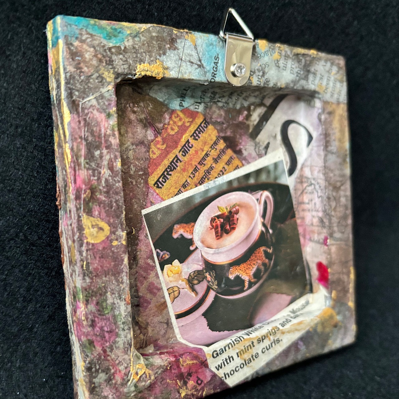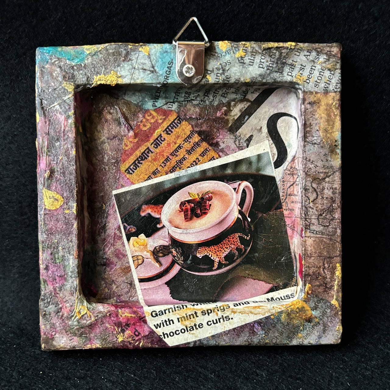 10cm角の小さなミニキャンバスに、英字新聞(インドの新聞)や雑誌の切り抜きなどを貼ってコラージュ。
