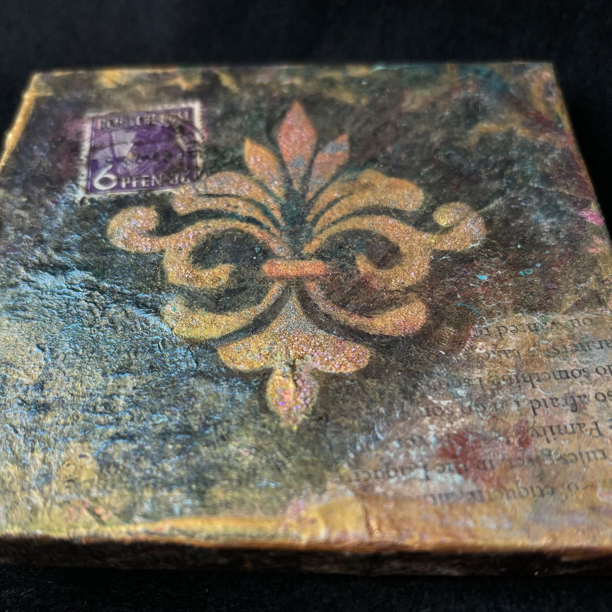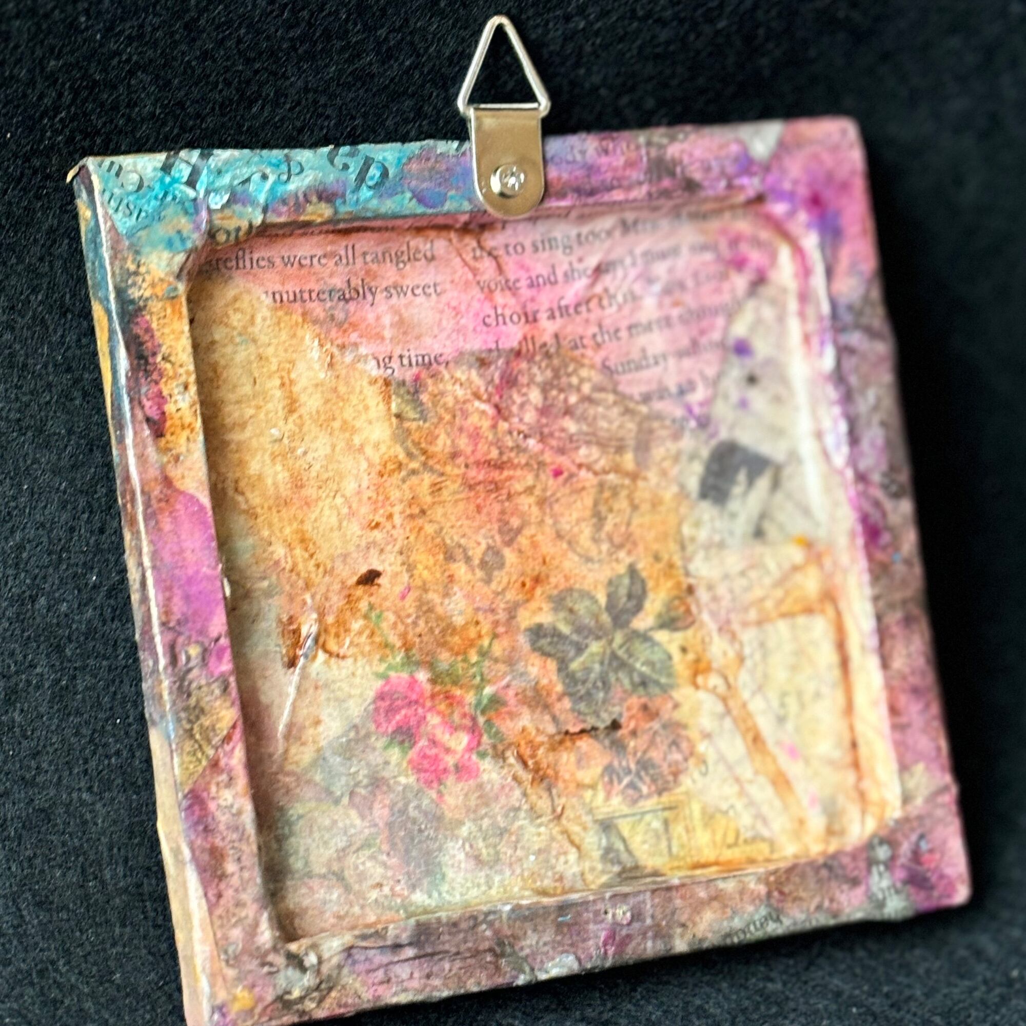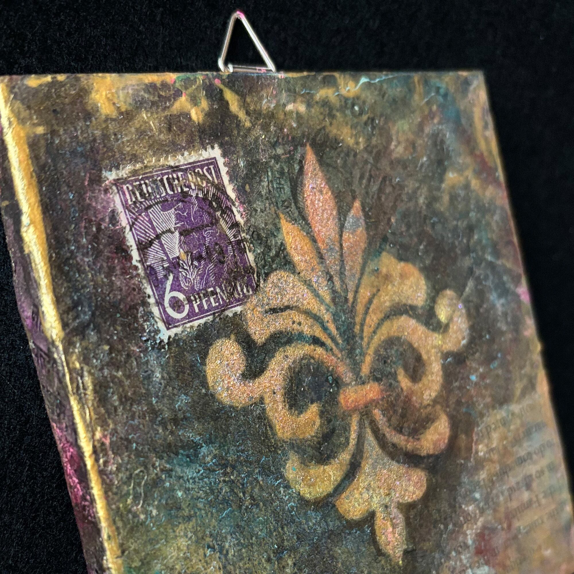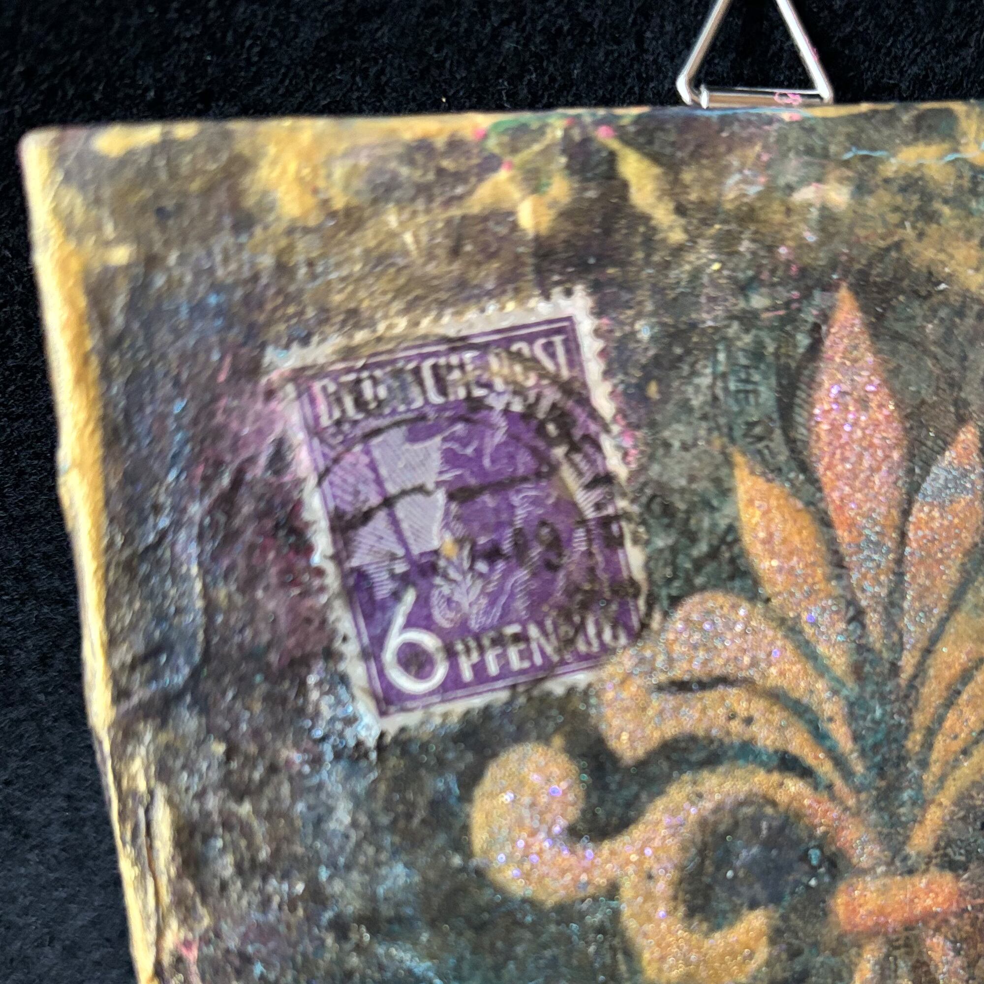 キャンバスの裏側にもアンティーク調のデザインペーパーをコラージュして遊び心を出しています。