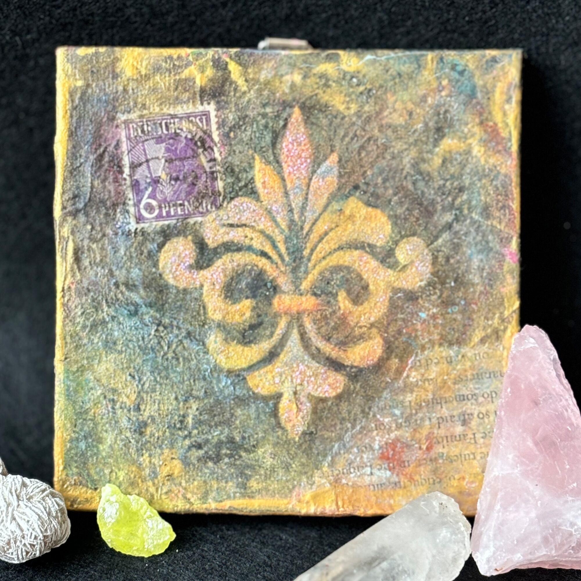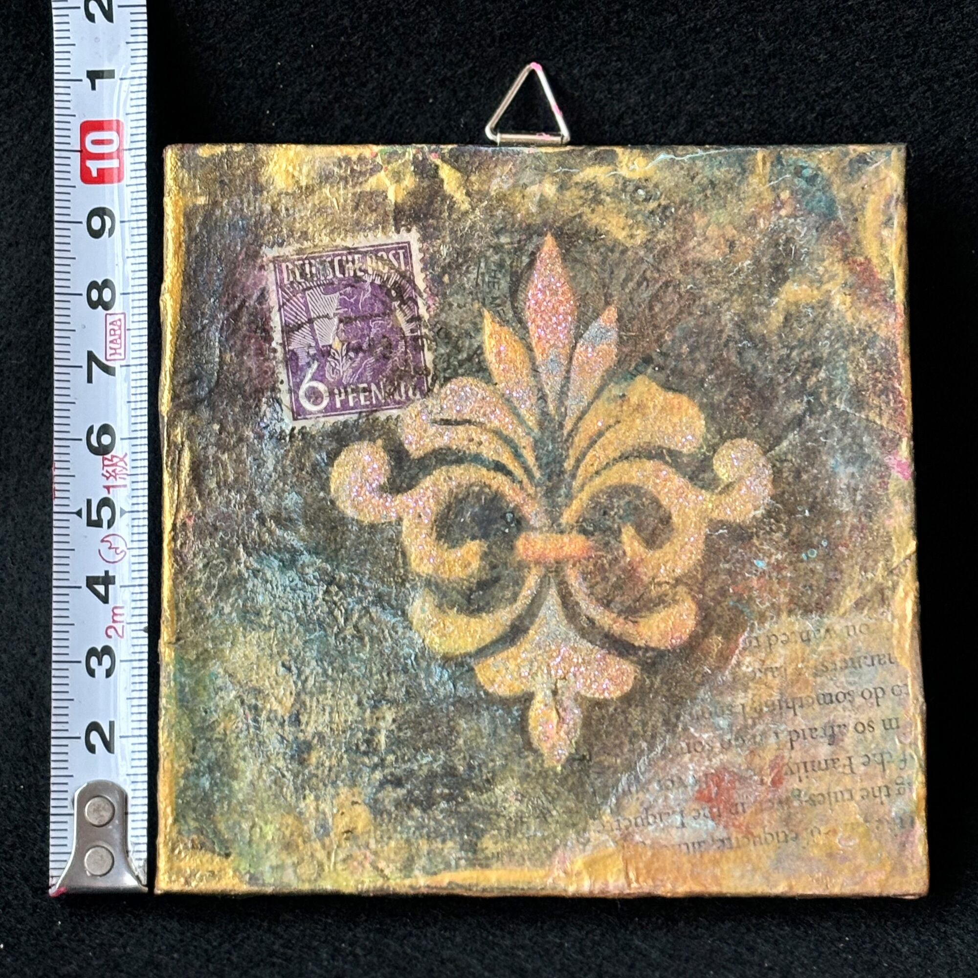 小さなキャンバス(10cm角)に、英字新聞や雑誌などでコラージュし、アイリスの花を模した図案をシルクスクリーンで載せました。