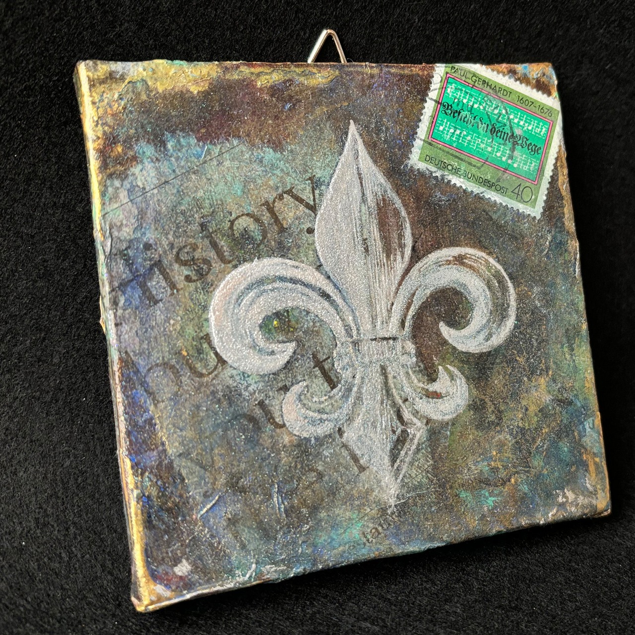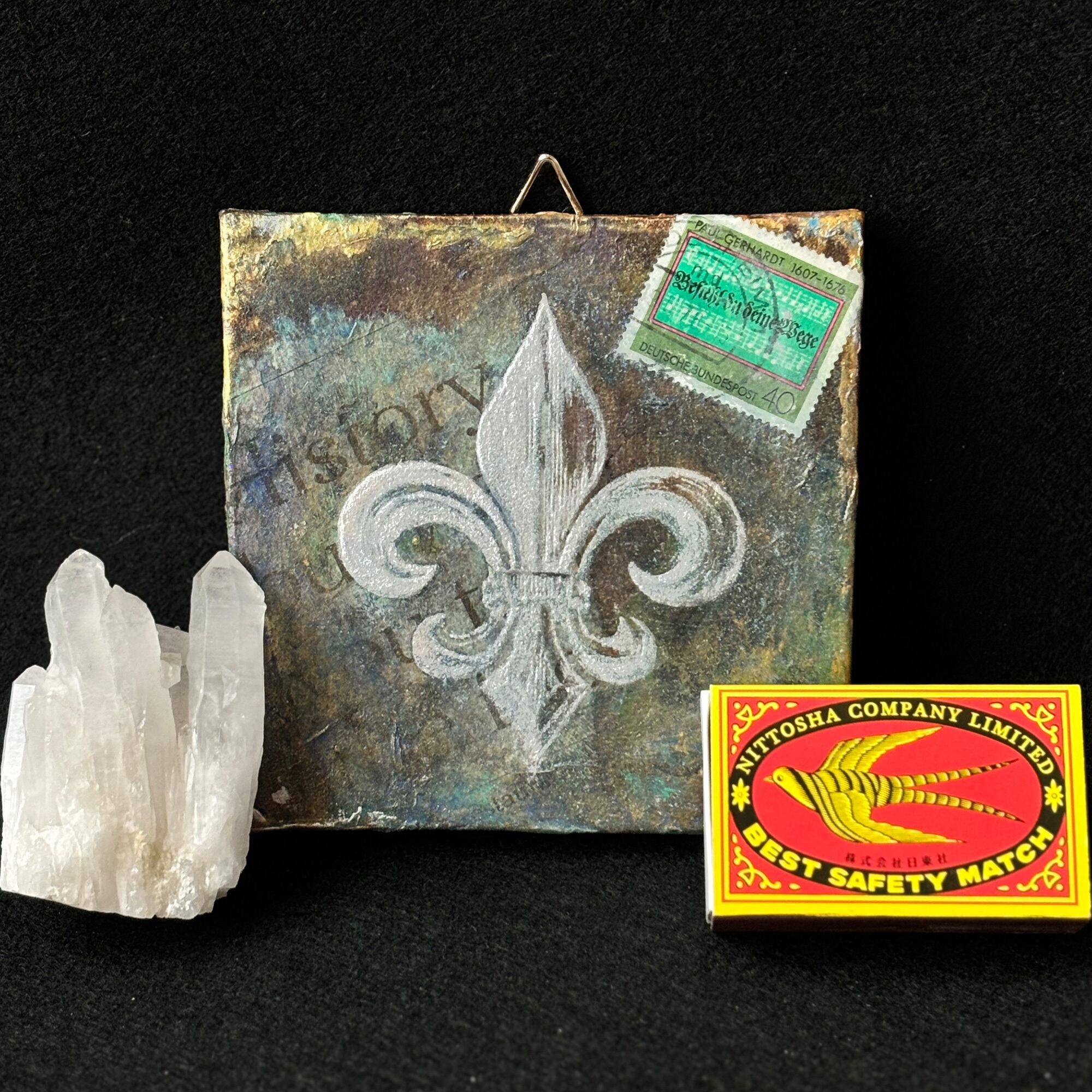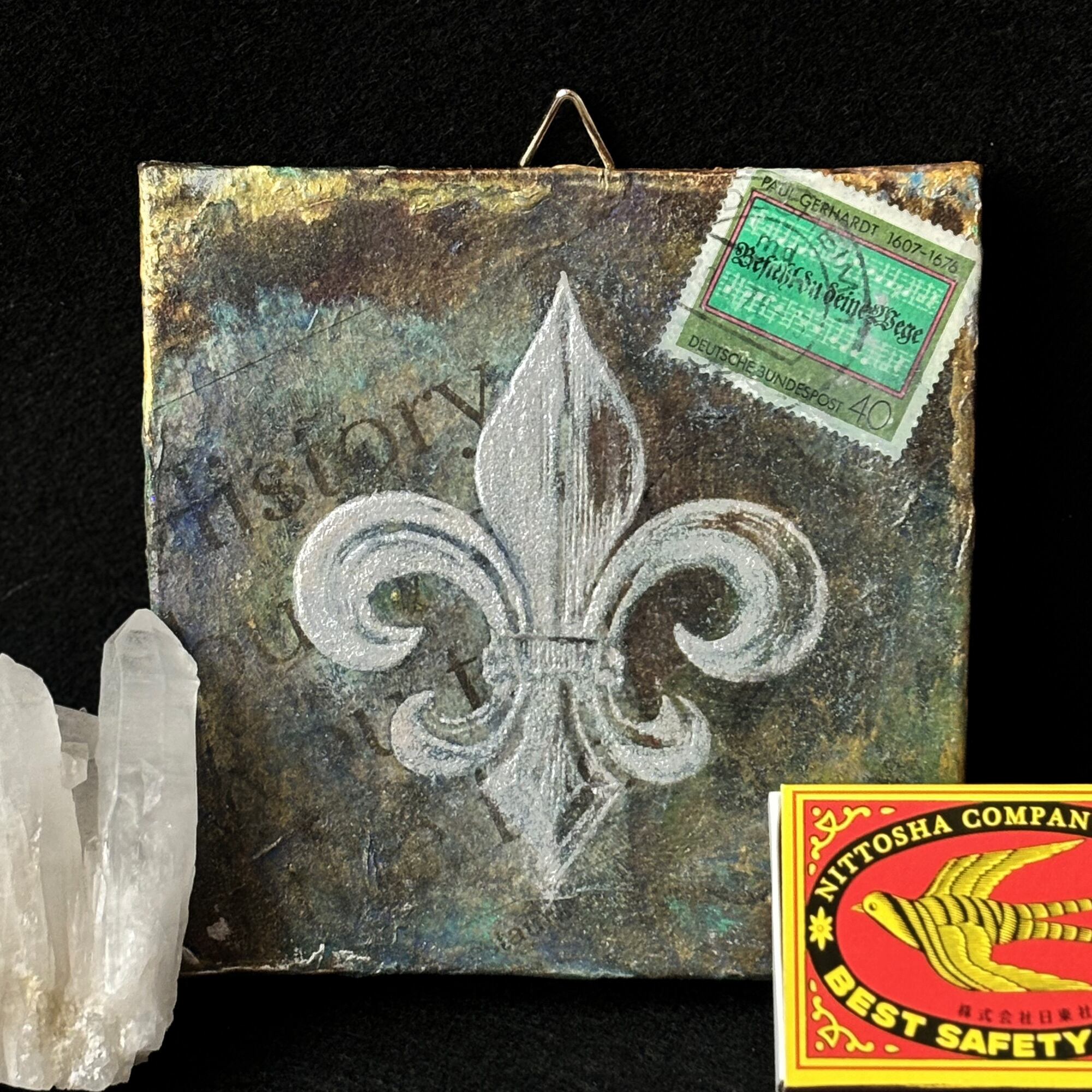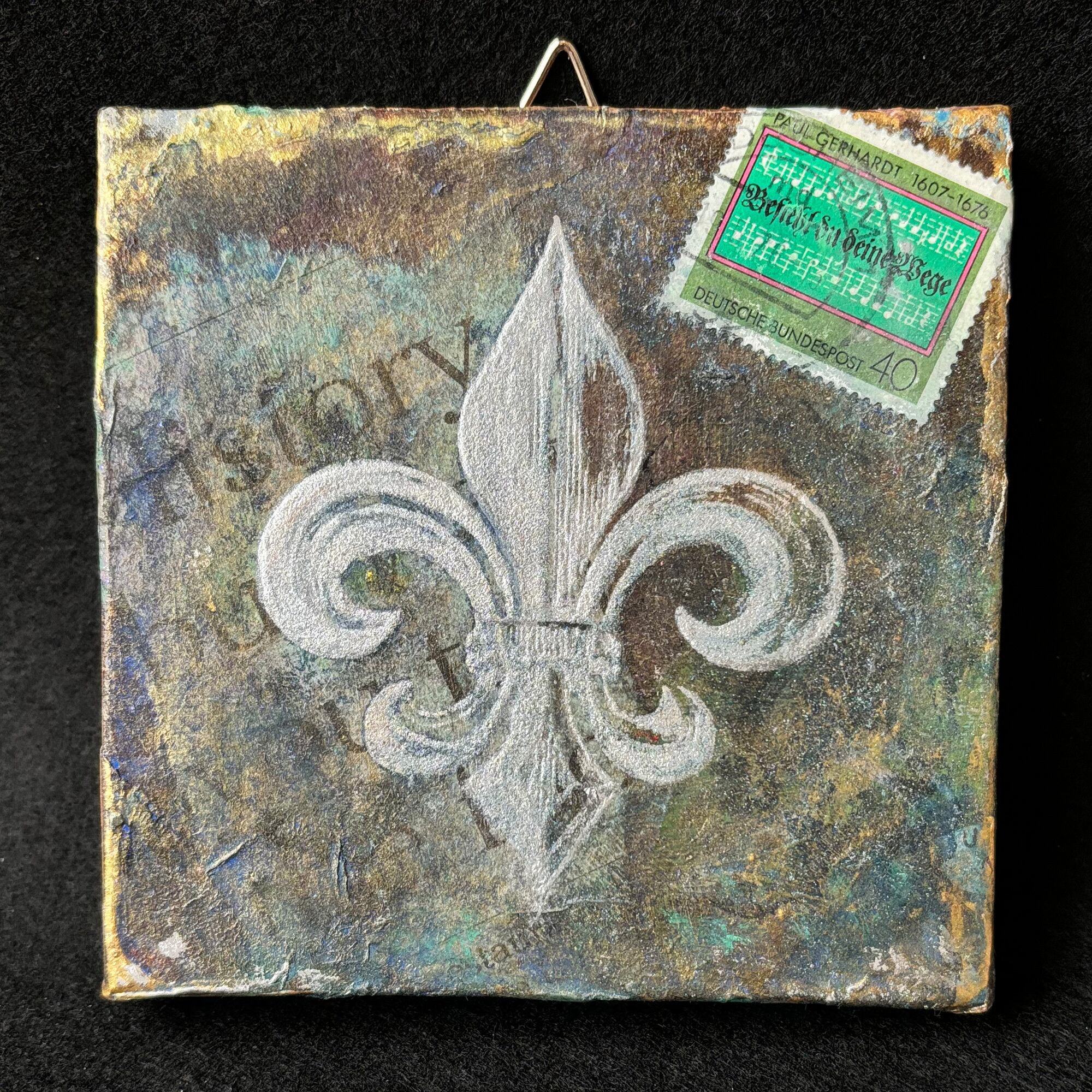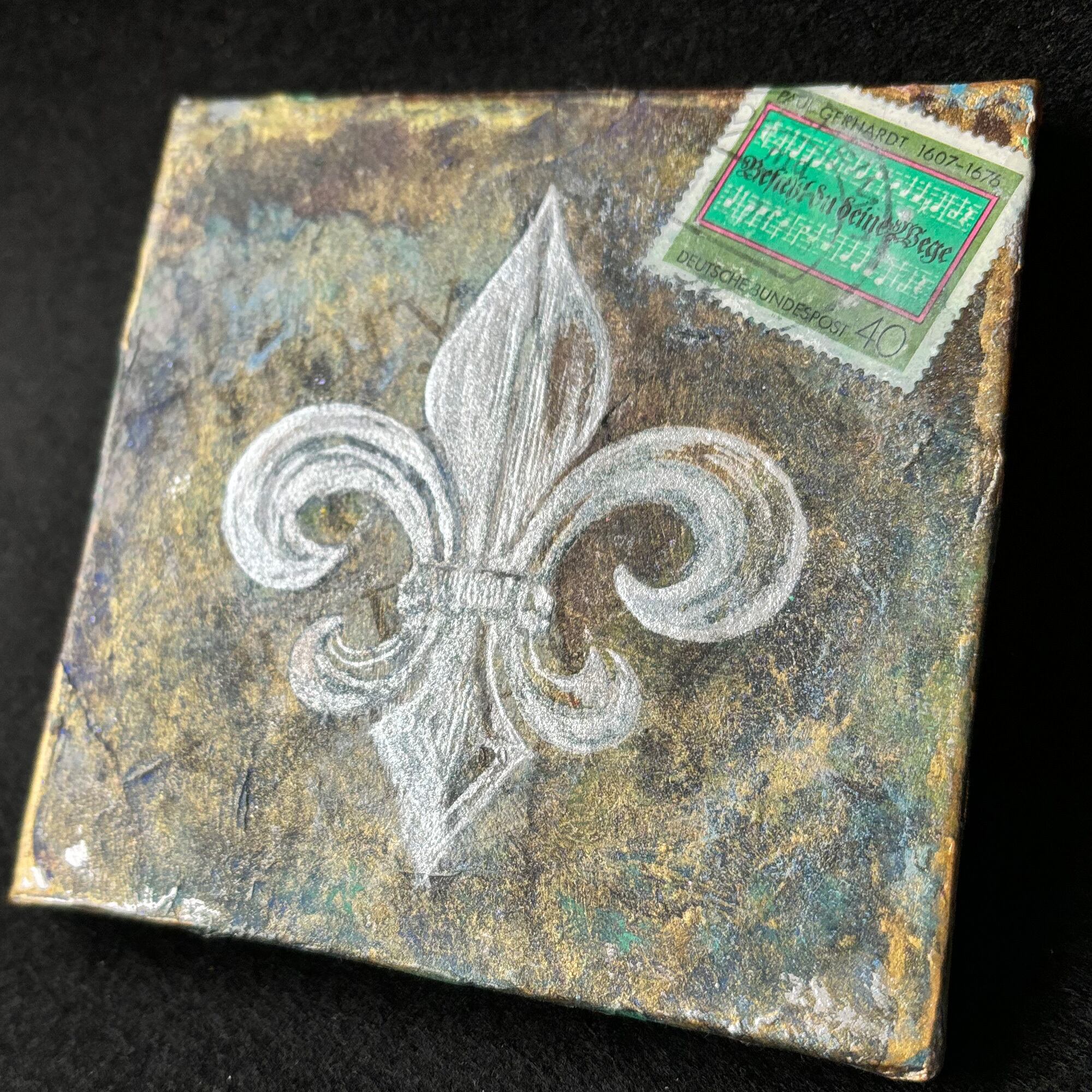 小さなキャンバス(10cm角)に、英字新聞や雑誌などでコラージュし、アイリスの花を模した図案をシルクスクリーンで載せました。